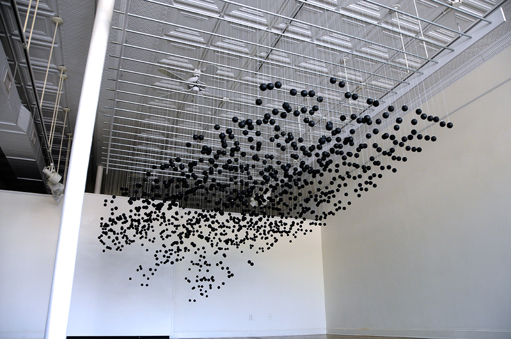 Michael Murphy es conocido por crear ilusiones ópticas que, cuando se miran desde el lugar adecuado, muestran un objeto. Su última creación, Damage, está formada por 1.200 pelotas negras de ping-pong suspendidas del techo que, desde un punto concreto, forman un rifle de asalto. | Fuente: My Modern Met