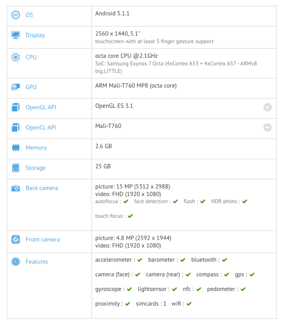 Este terminal lleva por número de modelo STV100-1 y, según los datos del benchmark, cuenta con un procesador Exynos 7420 con ocho núcleos, 3GB de RAM, 32GB de almacenamiento interno, Android 5.1.1 y pantalla Quad HD de 5.1″