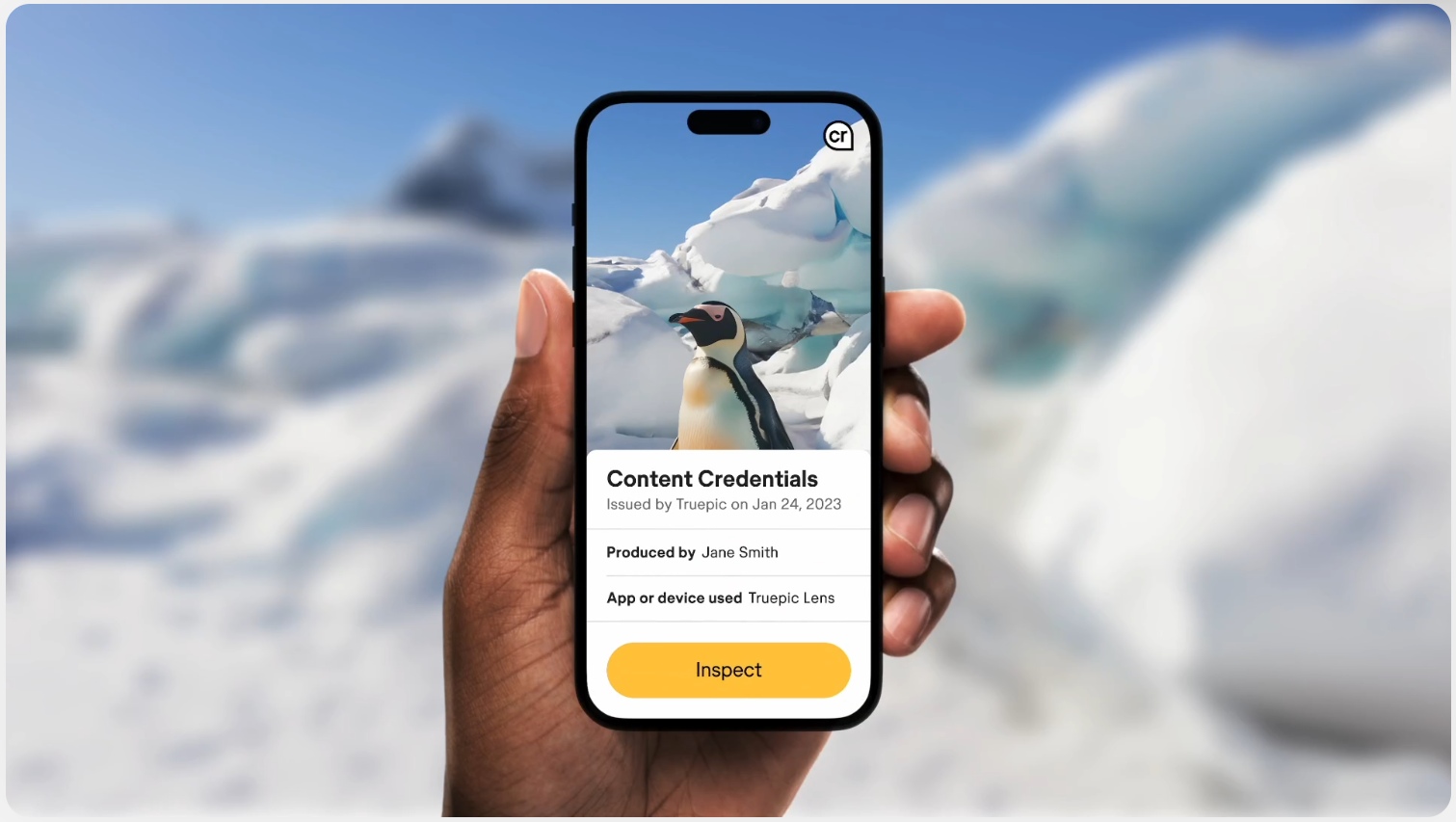 Cuando un usuario haga clic en la Credencial de Contenido, podrá ver quién produjo la imagen, qué software de IA se utilizó para crearla y la fecha en que se emitió el icono.
