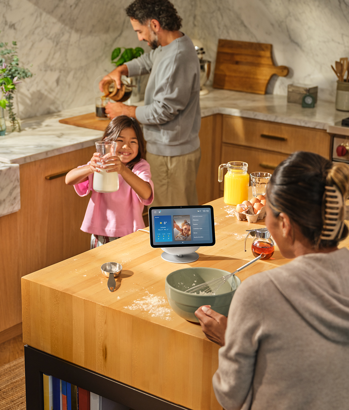 Familia cocinando en la cocina con asistente de voz en pantalla inteligente, desayuno saludable y ambiente hogareño.