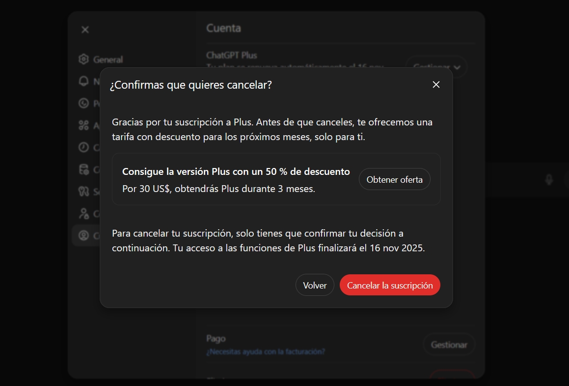 En las últimas semanas, algunos usuarios se han dado cuenta de que, al iniciar la cancelación de su suscripción a ChatGPT Plus, aparece una oferta temporal para mantener la suscripción con un 50% de descuento durante 3 meses.