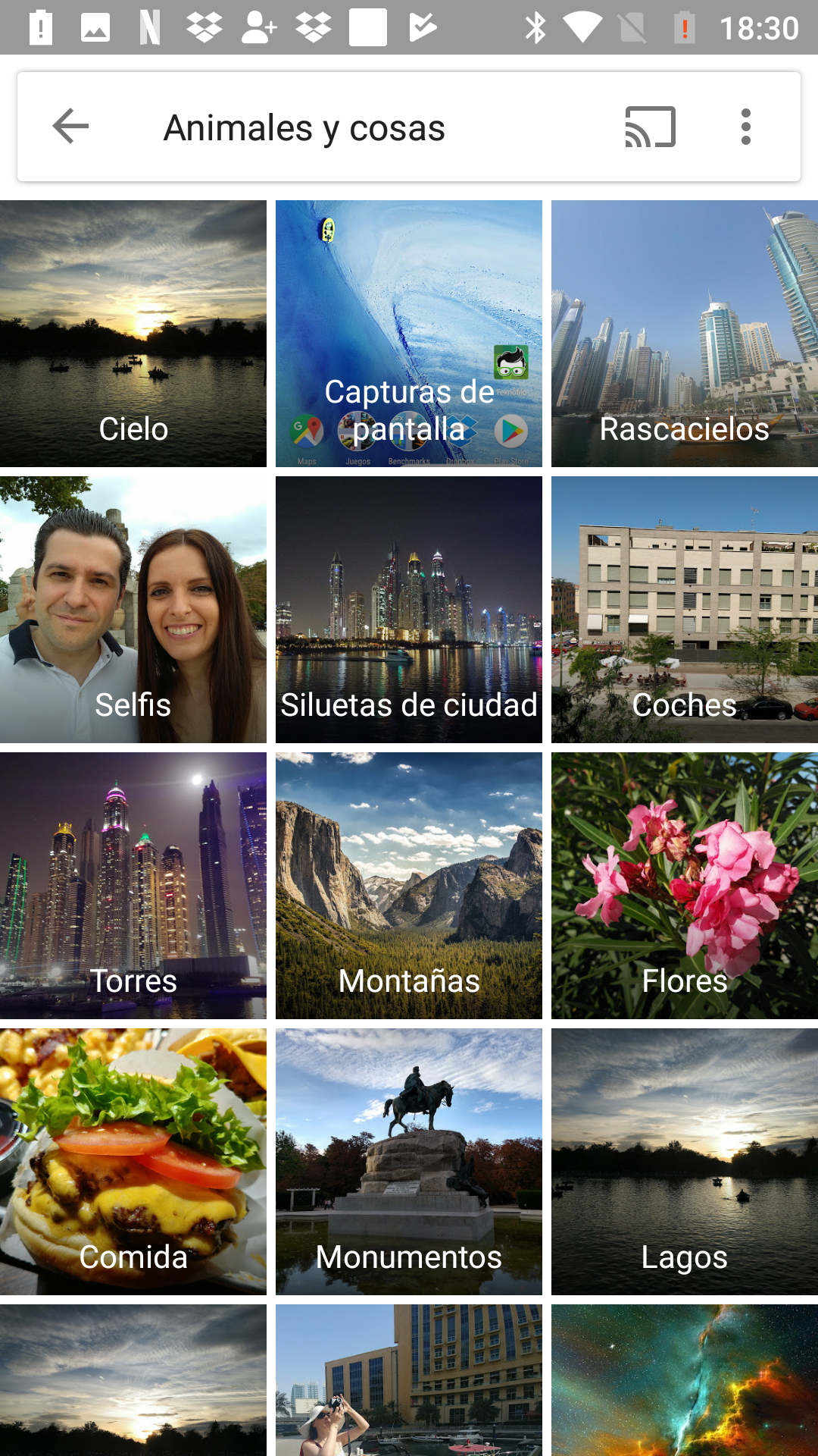 En el apartado «cosas» podemos ver fotografías organizadas según elementos que ha identificado Google en las fotos. Por ejemplo, podemos ver fotos donde aparezcan «coches», «comida» o «pájaros».