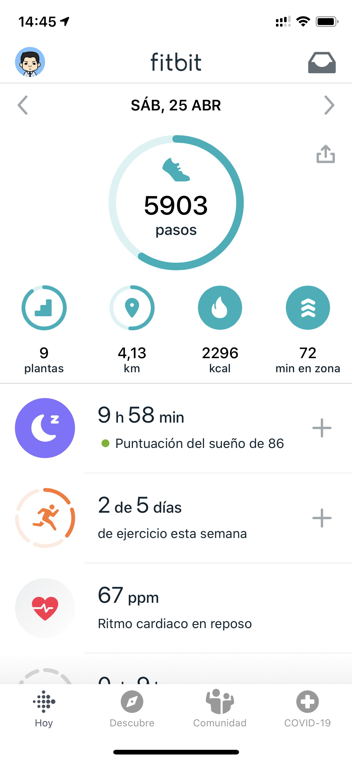 La aplicación Fitbit organiza la información en tres pestañas: Hoy, Descubre y Comunidad. Recientemente, se ha añadido una cuarta pestaña llamada COVID-19 con información y recursos sobre el coronavirus.