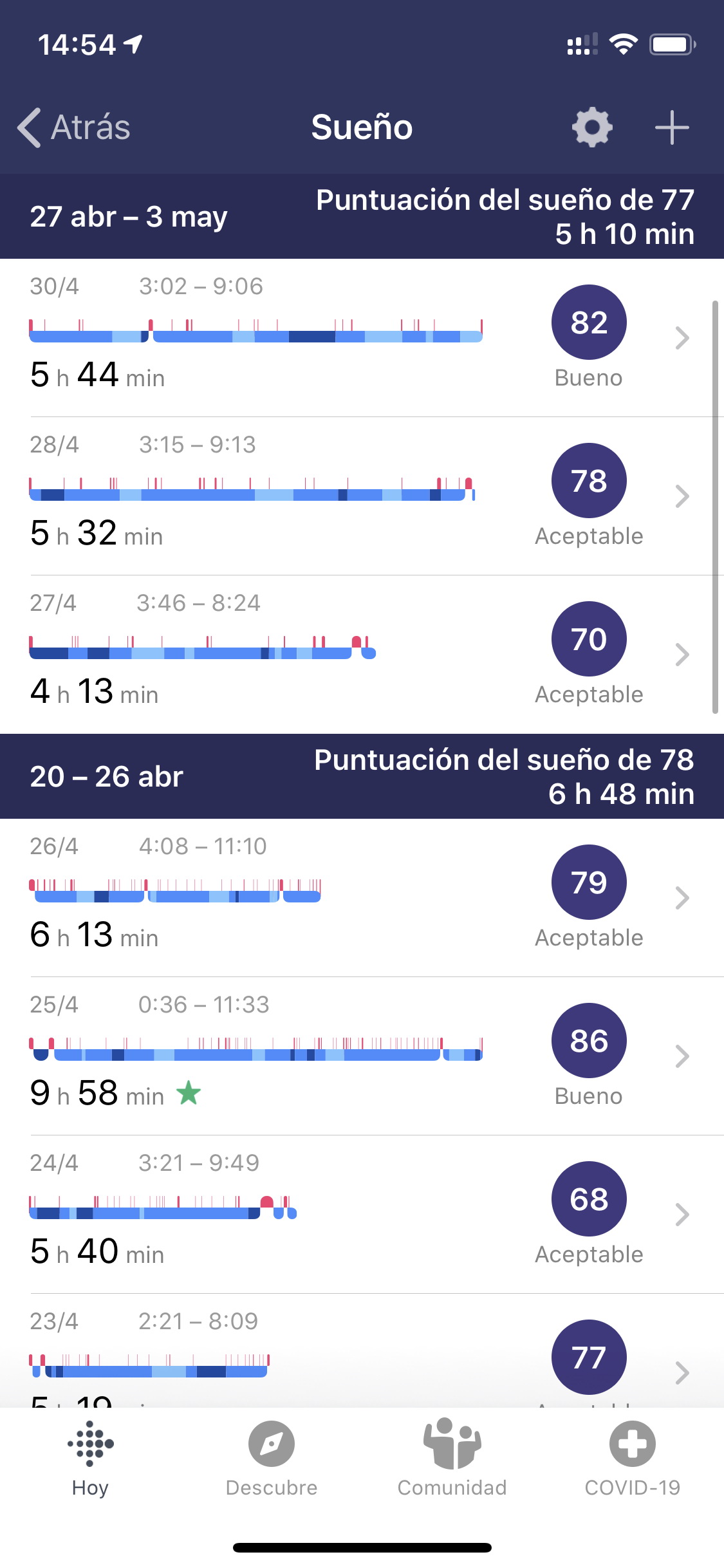 La app de Fitbit muestra una gráfica con las horas de sueño de cada día y, si pulsas sobre un día en concreto, puedes ver cómo has ido cambiando entre las fases REM, sueño ligero y sueño profundo. También puedes ver el porcentaje de tiempo que has pasado en cada fase y, si pulsas el botón Comparativa, puedes ver cómo se comparan tus estadísticas con las de otras personas de tu misma edad y sexo.