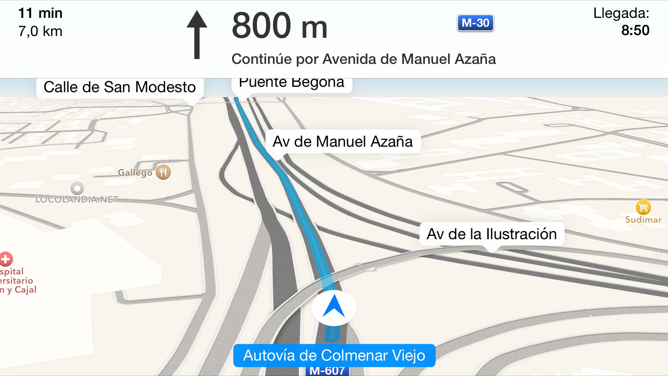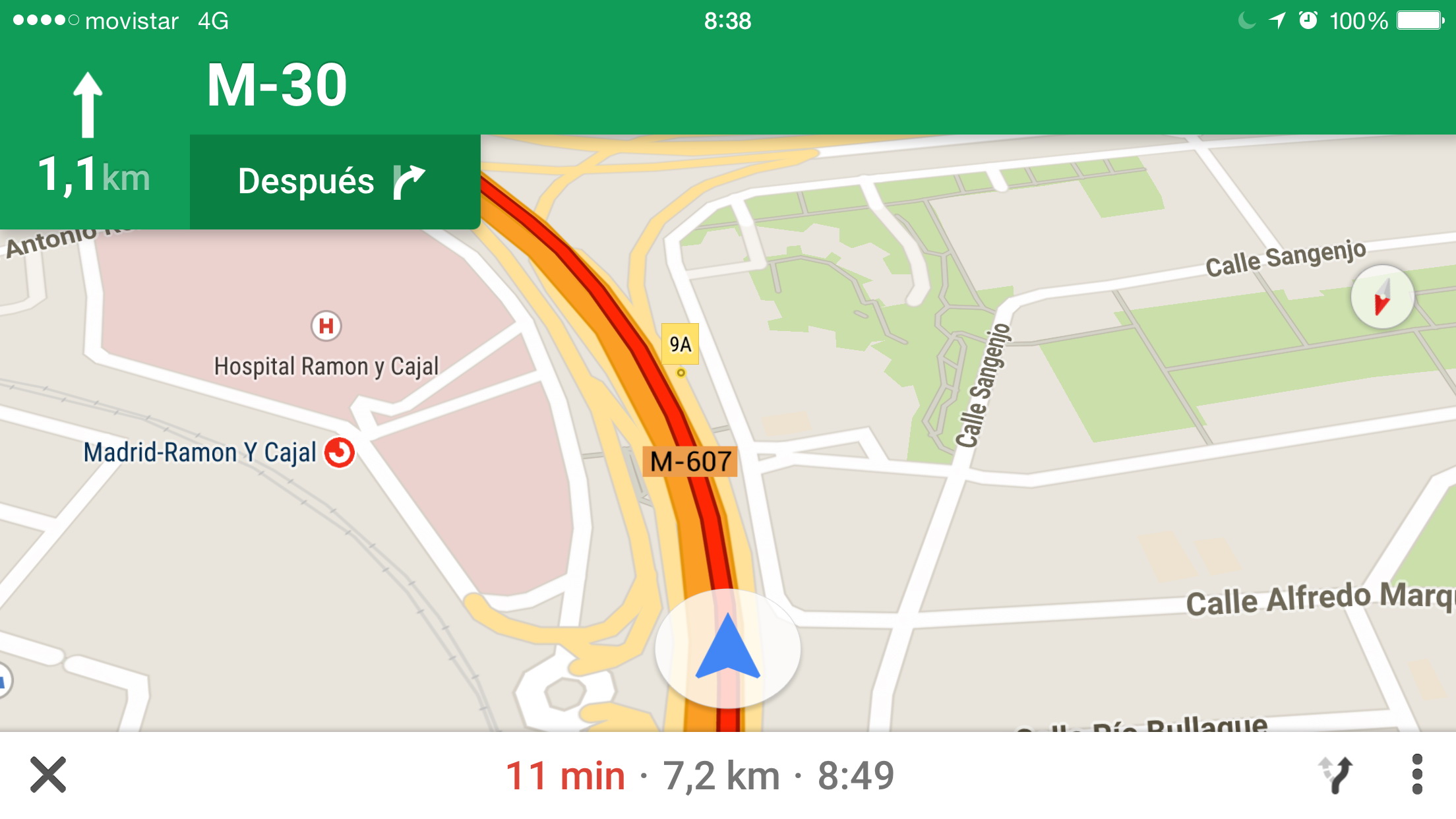 Una vez seleccionado un destino, podemos ver una pantalla con la ruta junto con el tiempo estimado hasta el destino, la distancia total, y la hora esperada de llegada.