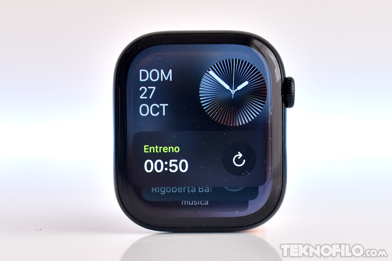 La pantalla del Apple Watch Series 10 se ve muy nítida y ofrece un brillo elevado (2.000 nits). Además, Apple ha mejorado la visibilidad bajo ángulos extremos y, con la tecnología LTPO3, ahora el contenido se actualiza cada segundo cuando utilizamos la pantalla siempre activa.