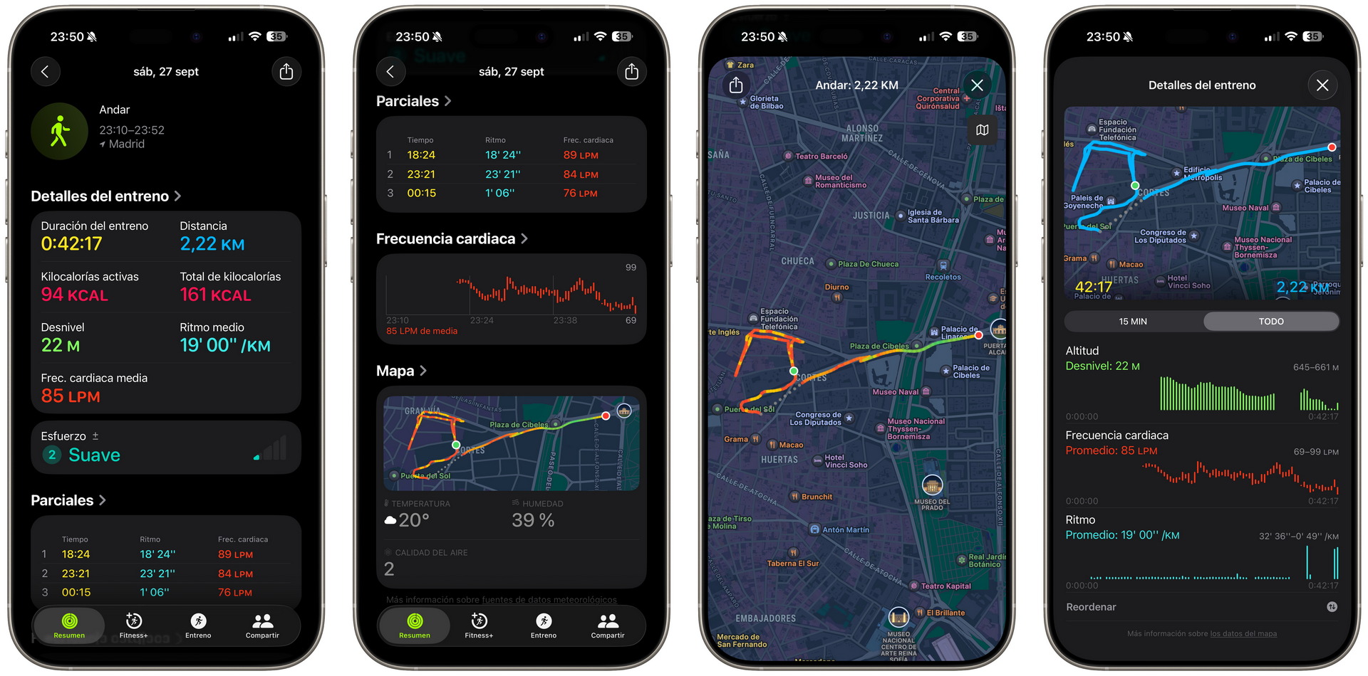 El Apple Watch Series 11 integra un chip GPS L1 (una sola banda), por lo que podemos salir a hacer deporte sin llevar el iPhone a cuestas y el reloj registra la distancia, el ritmo y el itinerario que has recorrido. Aunque otros relojes inteligentes también incorporan GPS propio, no todas las pulseras de actividad física cuentan con esta funcionalidad, que es muy útil para los deportistas.