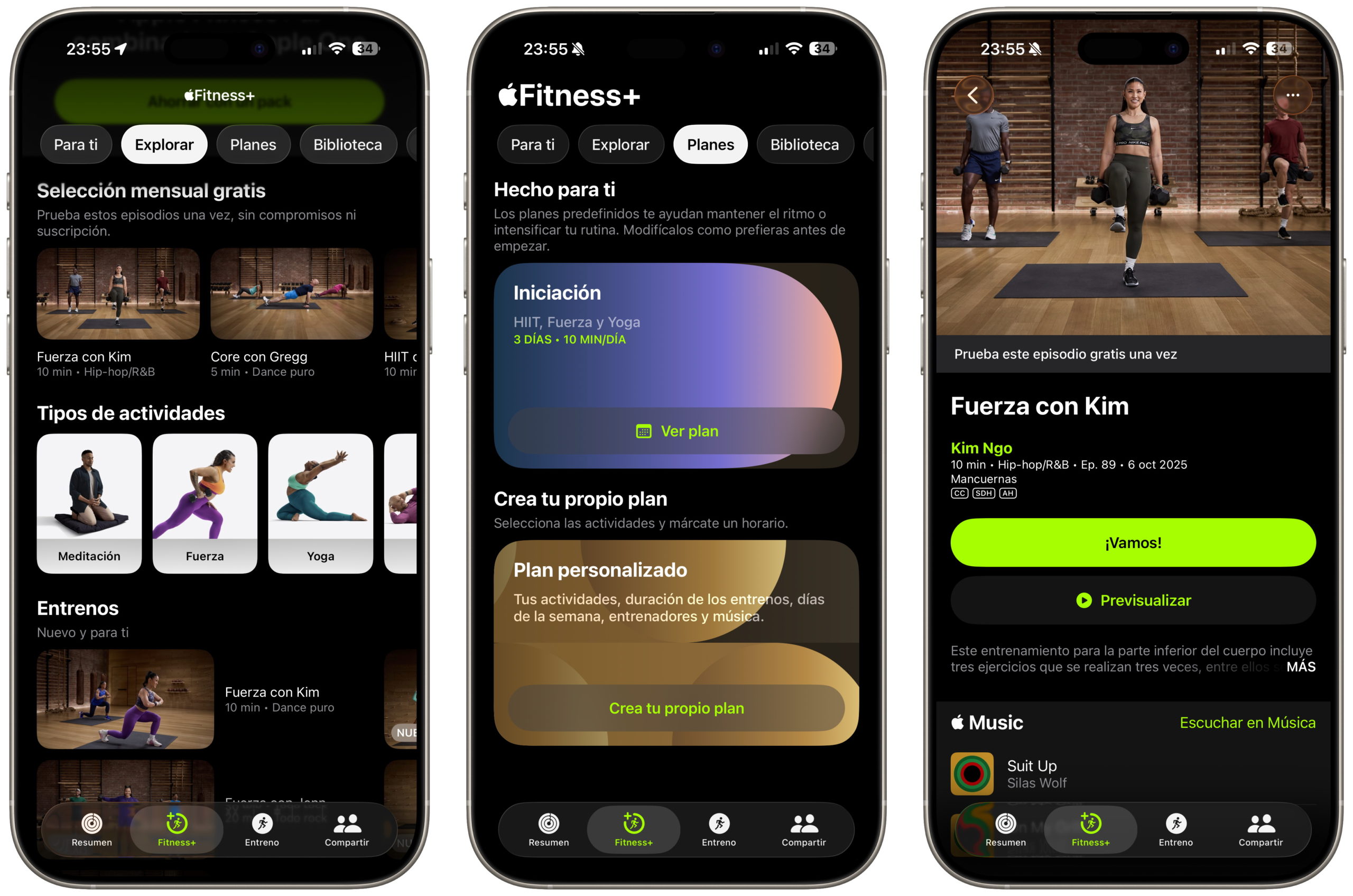 El reloj ofrece la detección automática de entrenos, así como una gran cantidad de entrenos donde elegir, incluyendo el Multideporte que cambia entre cualquier secuencia de natación, ciclismo y carrera automáticamente. Apple ofrece el servicio de suscripción Fitness+ (9,99€/mes o 79,99€/año, con 3 meses gratis), que ofrece entrenamientos guiados y permite ver en la pantalla de tu dispositivo tus estadísticas en tiempo real.