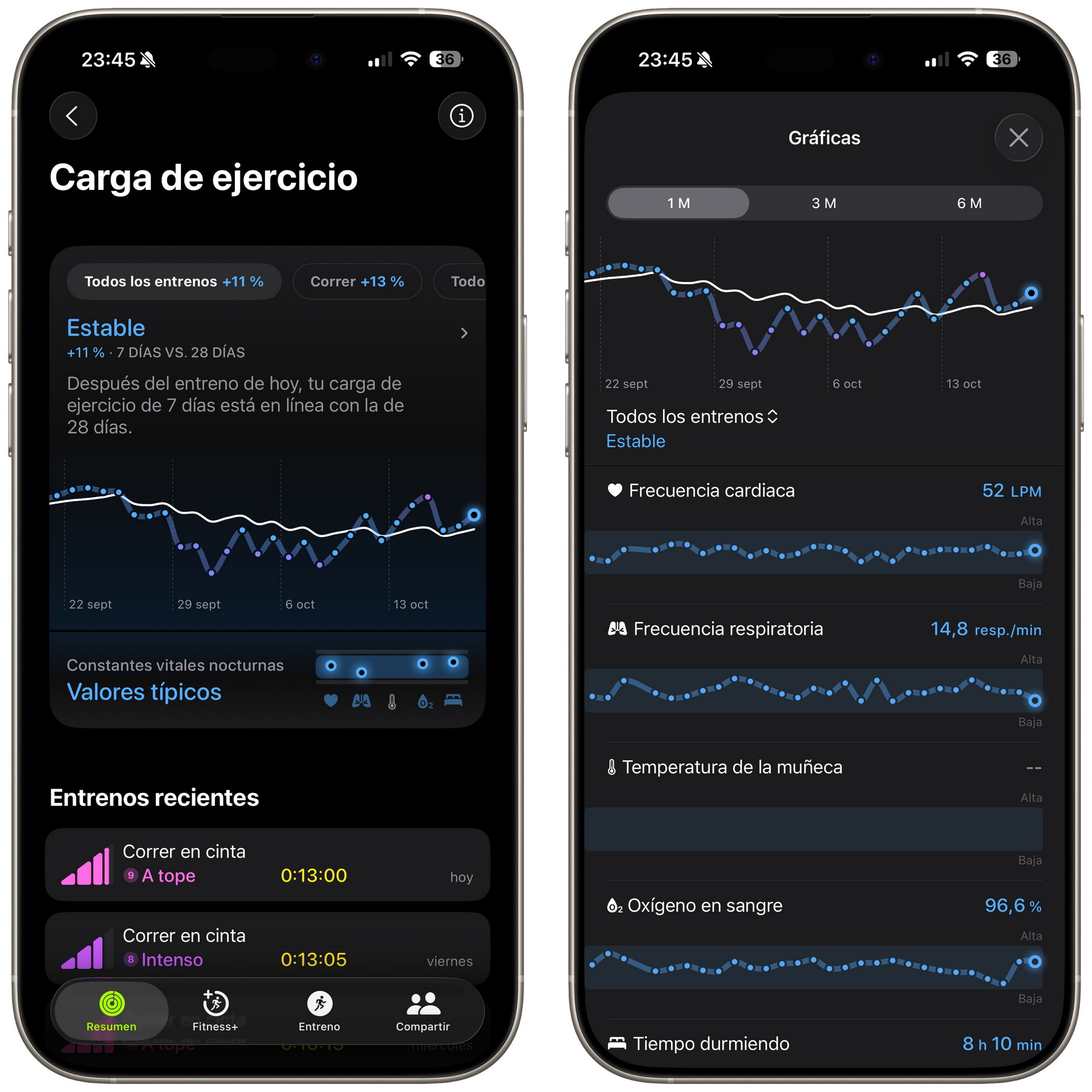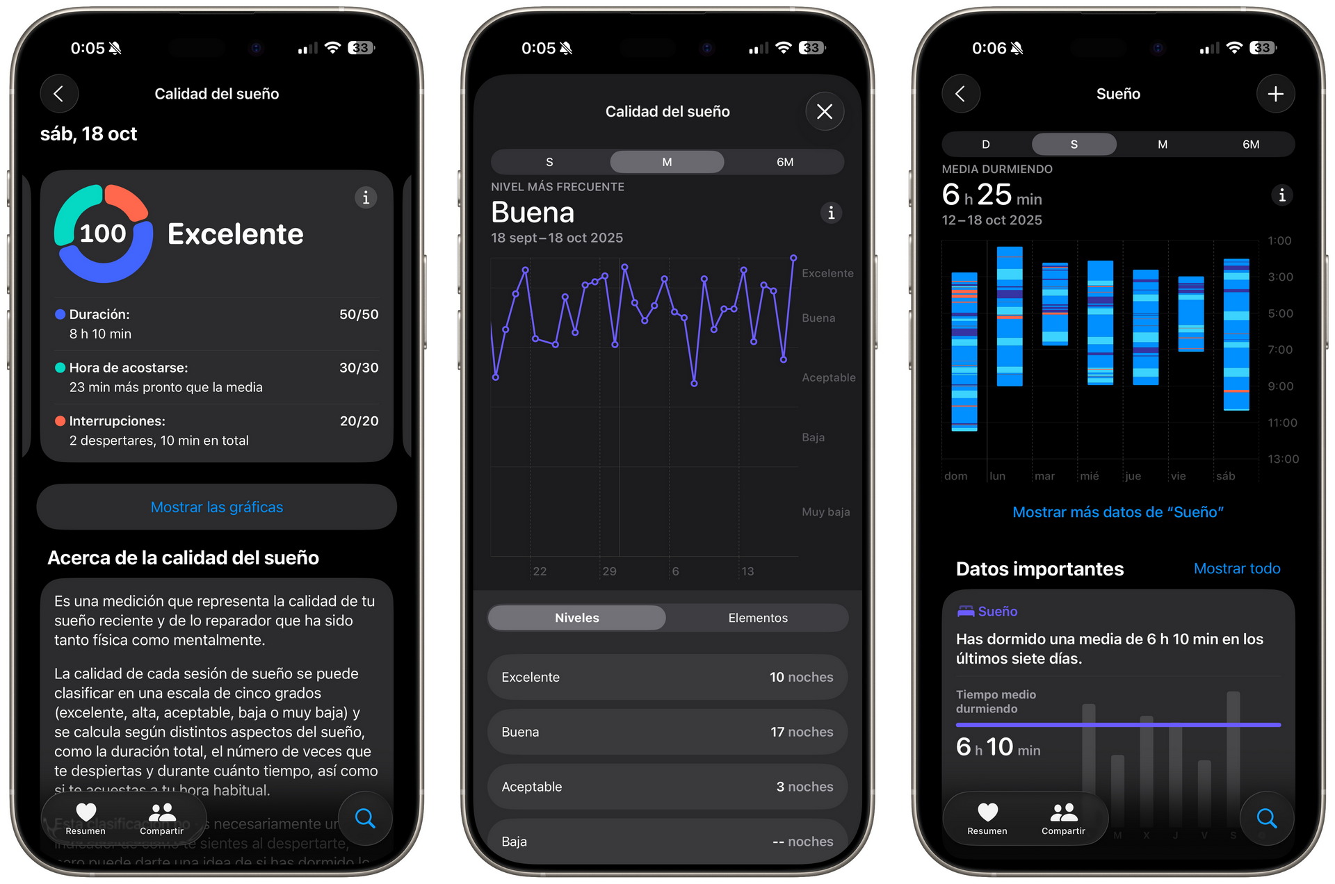Los datos de las fases de sueño se ven en la app Sueño del Apple Watch. Y en las gráficas comparativas de la app Salud del iPhone, puedes consultar información más detallada, como el tiempo que pasas durmiendo y otras mediciones, como el ritmo cardíaco y la frecuencia respiratoria.