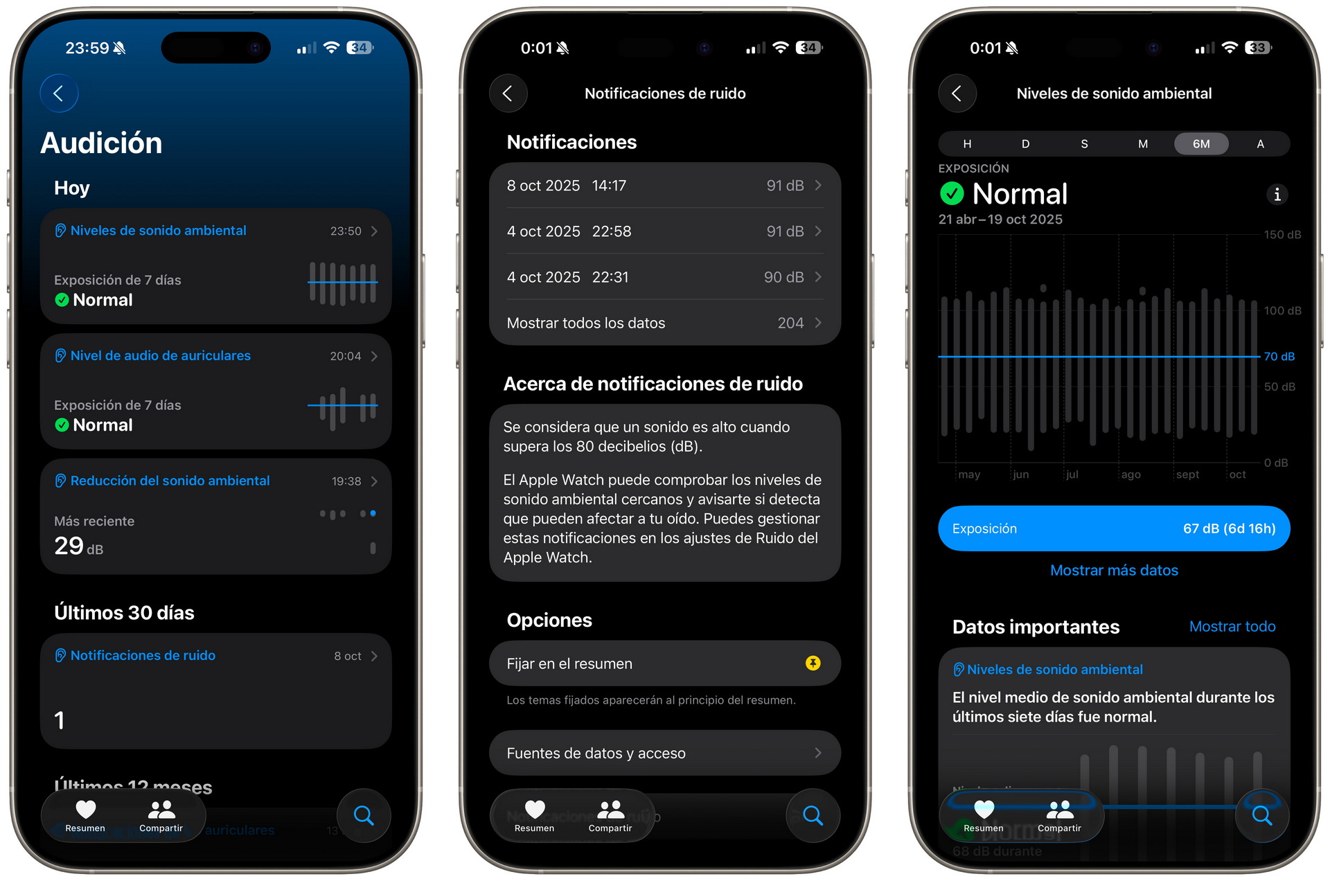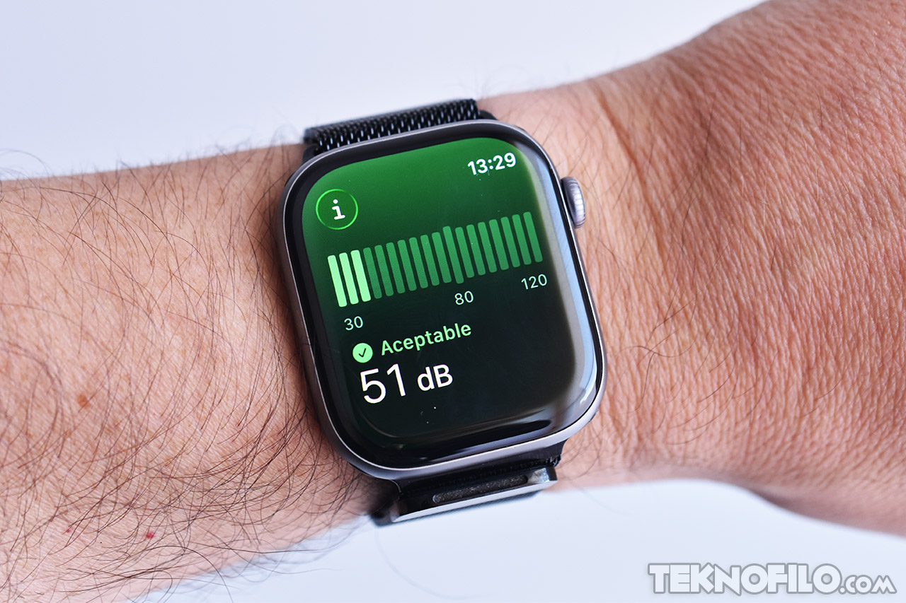 Apple incluye una app llamada Ruido enfocada a la salud auditiva. Esta app te avisa si el nivel de ruido ambiente es demasiado elevado para que puedas alejarte o ponerte unos tapones. Si detecta que los decibelios han llegado a un nivel preocupante, te avisa con un toque en la muñeca.