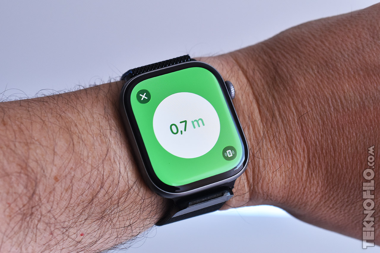 El chip de banda ultraancha permite utilizar la conexión inalámbrica de corto alcance para, por ejemplo, abrir el coche con llaves digitales de última generación. Además, si tienes un iPhone 15 o posterior, que también están equipados con este chip, puedes localizarlos desde el reloj mediante la búsqueda con precisión, indicando distancia y dirección a tu iPhone, incluso si está en otra habitación.