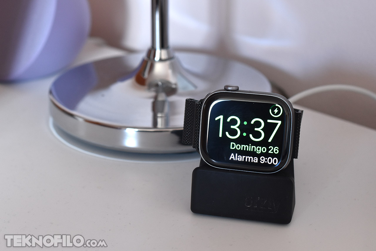 Dado que en su día no conseguí encontrar una forma cómoda de colocar el Apple Watch sobre la mesilla estando acoplado a la base de carga, acabé comprando una base de apoyo para carga que me permite apoyar el Apple Watch y tener la seguridad de que hay contacto y carga. Reciente, la he sustituido por esta otra base de carga inspirada en los primeros Mac (🛒 17,99€)