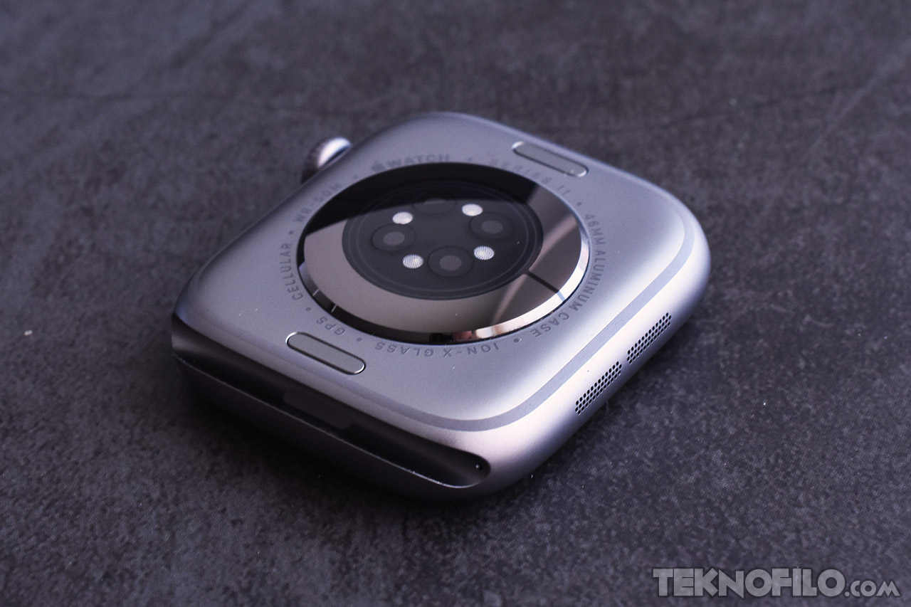 En la parte de atrás, encontramos un anillo circular que integra cuatro conjuntos LED y cuatro fotodiodos que permiten medir el ritmo cardíaco y la saturación de oxígeno en sangre. Los LED verdes, rojos e infrarrojos proyectan luz a los vasos sanguíneos de la muñeca, y los fotodiodos miden la cantidad de luz reflejada. Unos algoritmos avanzados calibran el color de la sangre, lo que determina el nivel de oxígeno que contiene.