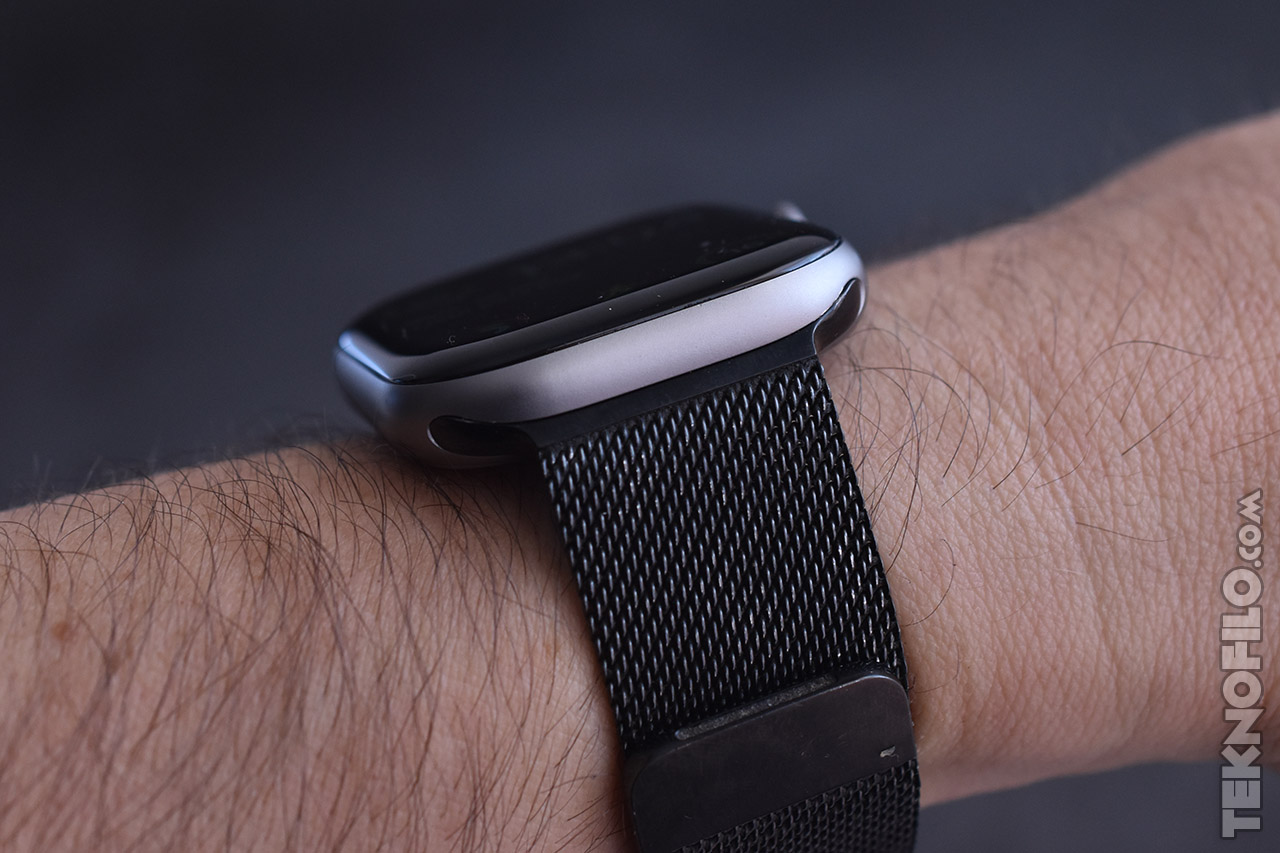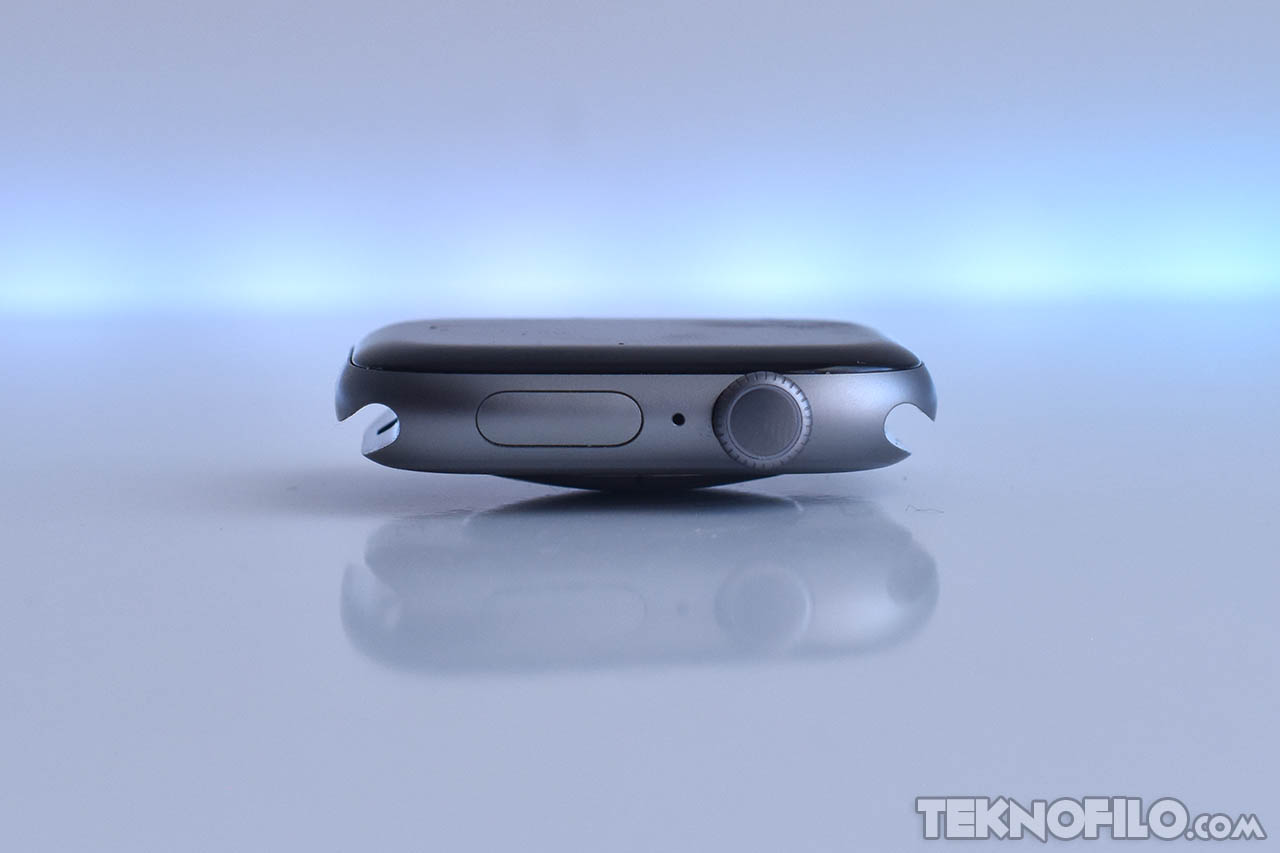 A la izquierda de la caja encontramos el altavoz, que ahora se esconde detrás de un conjunto de microperforaciones. El altavoz suena bastante más potente de lo que cabría pensar viendo su tamaño. Aunque un reloj no es un dispositivo en el que vayas a querer escuchar música, el altavoz resulta útil para interactuar con Siri o incluso responder llamadas si no tienes el iPhone a mano.