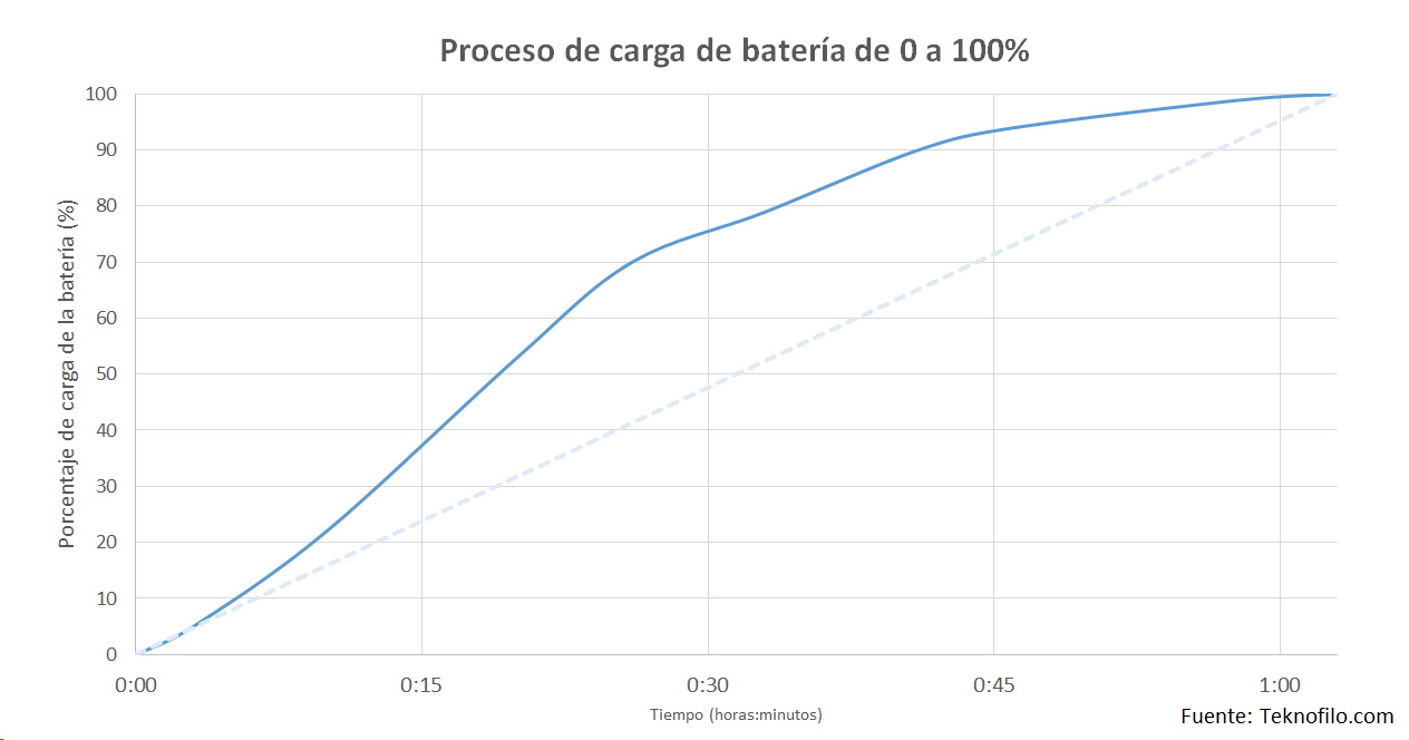 En mis pruebas, la carga se ha cargado completamente en aproximadamente una hora, y ha alcanzado el 50 por ciento en algo menos de 20 minutos.