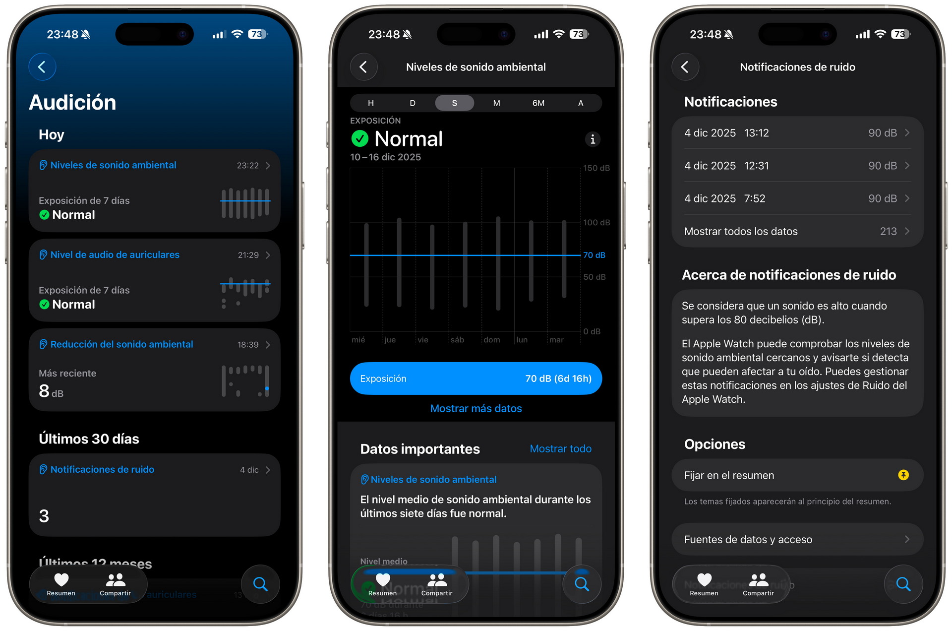Apple incluye una app llamada Ruido enfocada a la salud auditiva. Esta app te avisa si el nivel de ruido ambiente es demasiado elevado para que puedas alejarte o ponerte unos tapones. Si detecta que los decibelios han llegado a un nivel preocupante, te avisa con un toque en la muñeca.