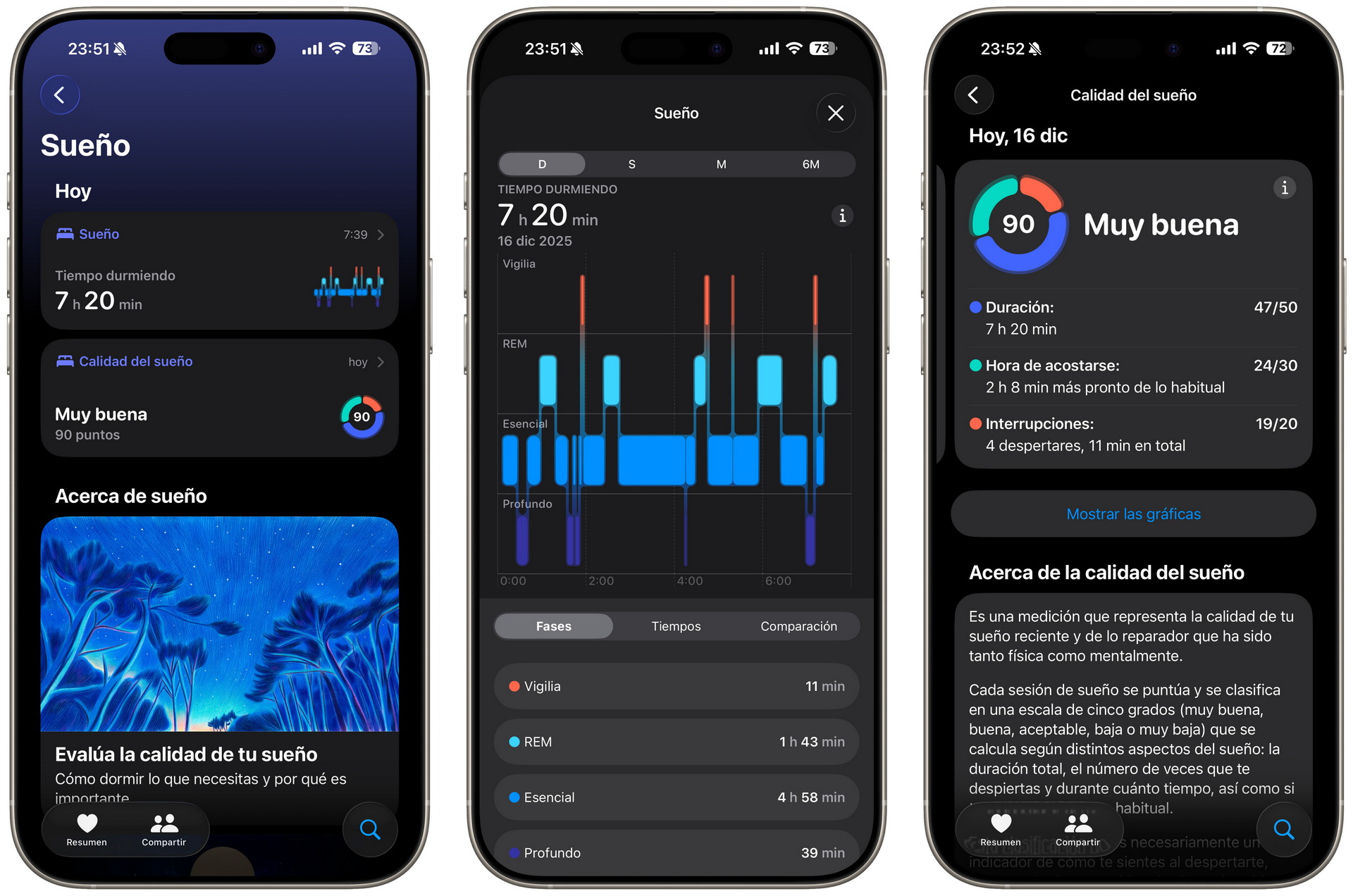 Los datos de las fases de sueño se ven en la app Sueño del Apple Watch. Y en las gráficas comparativas de la app Salud del iPhone, puedes consultar información más detallada, como el tiempo que pasas durmiendo y otras mediciones, como el ritmo cardíaco y la frecuencia respiratoria.