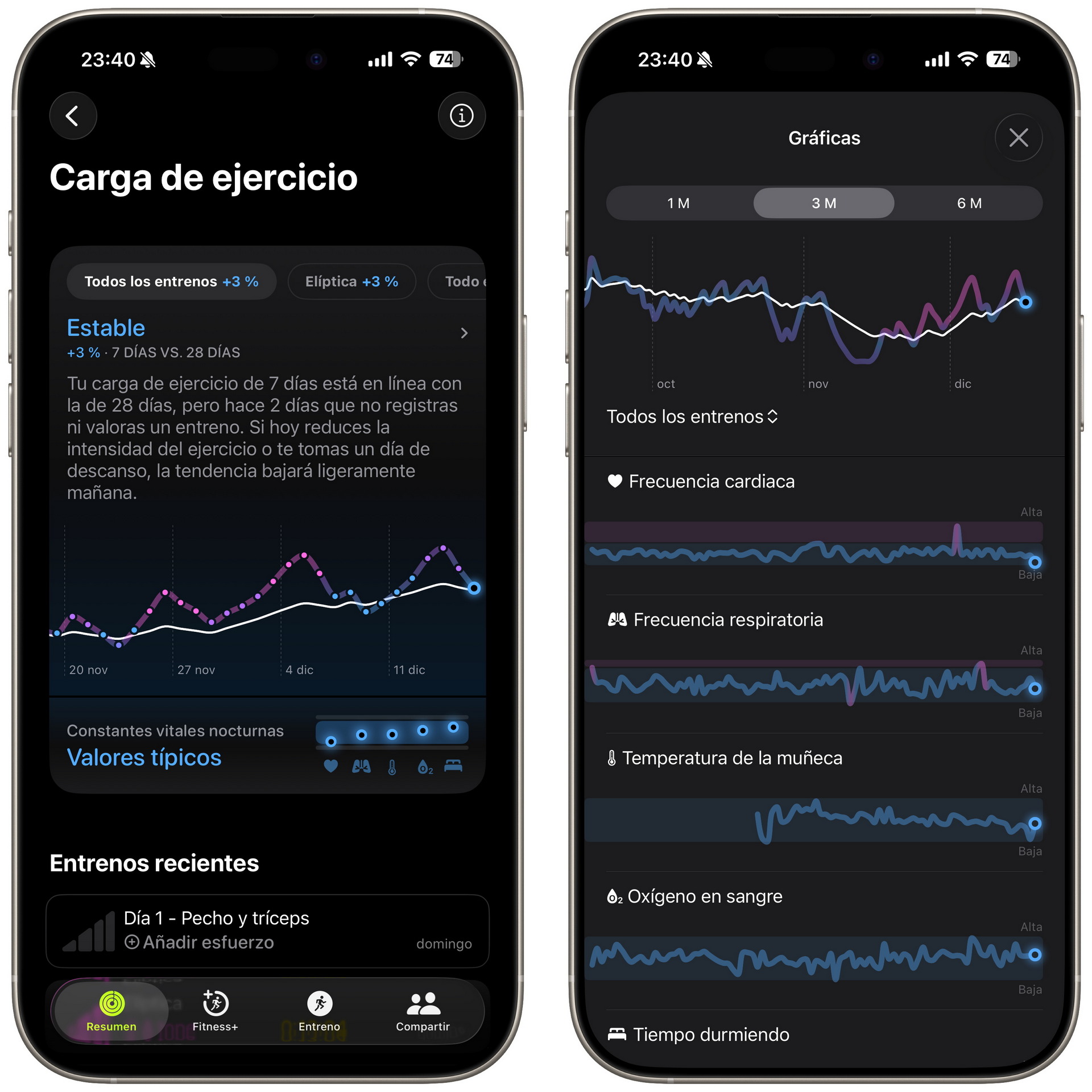 En deporte y salud, el Apple Watch Ultra 3 vuelve a destacar por la cantidad de métricas y herramientas disponibles. He encontrado muy útil la carga de entrenamiento para contextualizar semanas duras frente a semanas suaves, y las funciones de sueño (con tendencias y puntuación) son de las que te empujan a cuidarte sin darte cuenta. El hecho de poder exportar informes (como los relacionados con fibrilación auricular) también es un plus real para quien se tome en serio el seguimiento de salud, aunque siempre con la idea de que es una ayuda, no un sustituto médico.