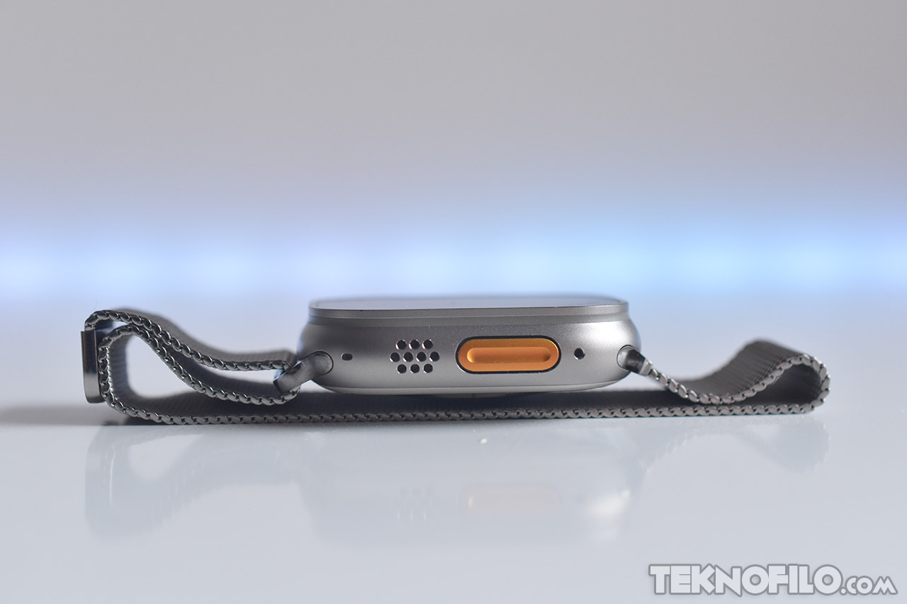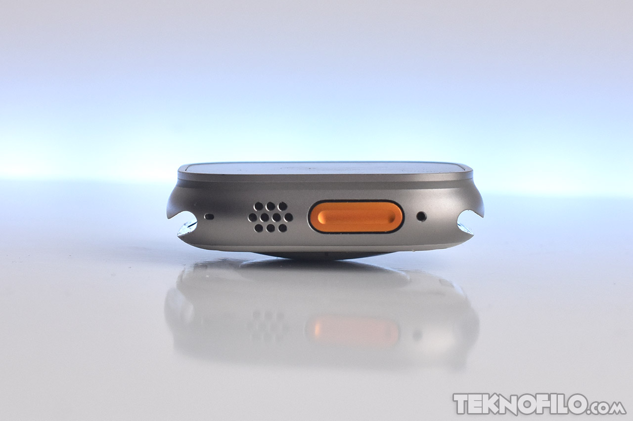 Junto al botón Acción, encontramos el doble altavoz. El Apple Watch Ultra 3 cuenta con tres micrófonos con tecnología de conformado de haz y reducción del ruido del viento, que facilita mantener conversaciones en exteriores.