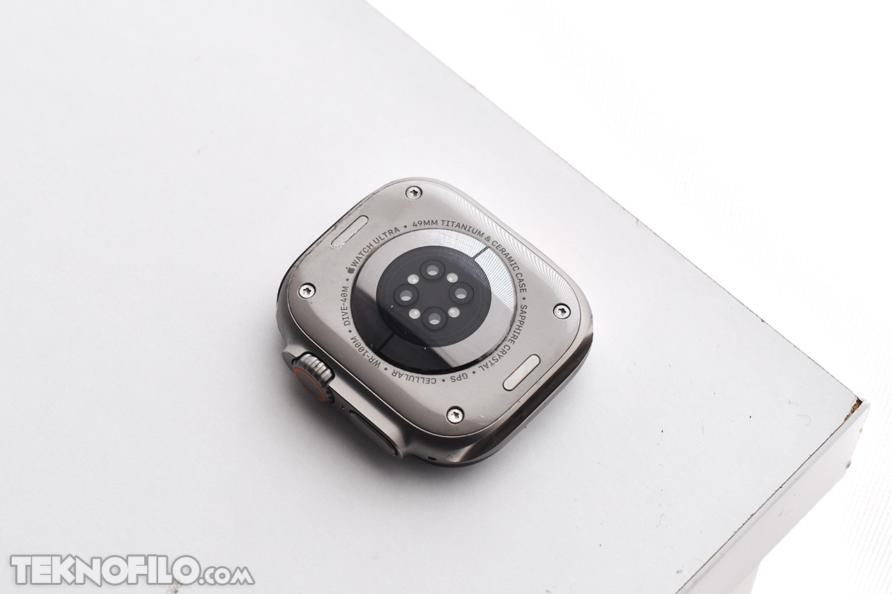 En la parte trasera del Apple Watch Ultra 3, encontramos un anillo circular que integra cuatro conjuntos LED y cuatro fotodiodos que permiten medir el ritmo cardíaco y la saturación de oxígeno en sangre.