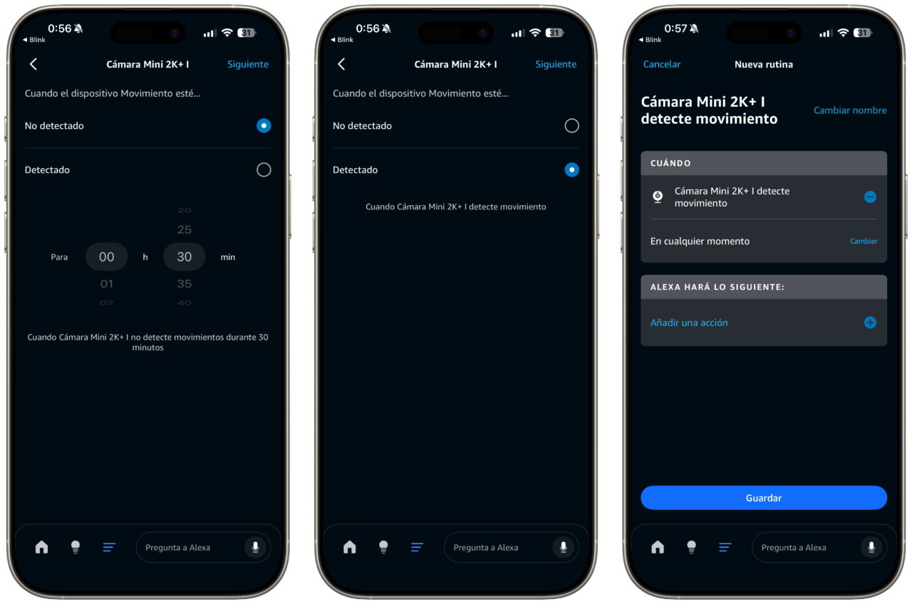 Con Alexa, es posible configurar rutinas que se ejecuten cuando se detecte o se deje de detectar movimiento durante un tiempo mínimo configurable. De esta forma, es posible, por ejemplo, hacer que se encienda una luz cuando alguien se acerque al campo de visión de la cámara.