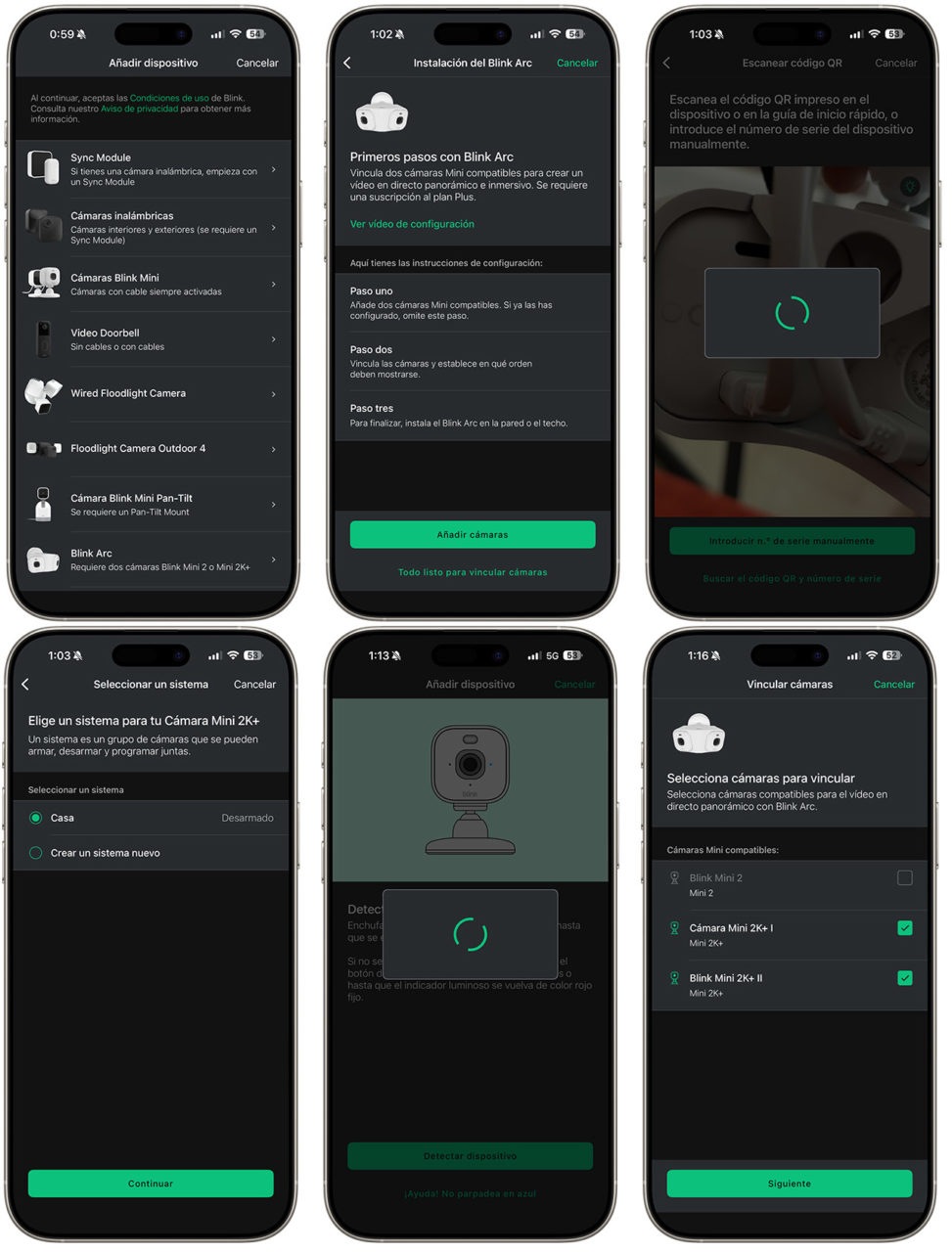 Para configurar la cámara, basta con instalar la app Blink en tu smartphone iOS o Android, y crear una cuenta desde la propia app si no la tienes ya. A continuación, pulsas sobre el icono «Agregar dispositivo» + en la pantalla de inicio de la aplicación Blink, escaneas el código QR de cada dispositivo y sigues las instrucciones de la app.