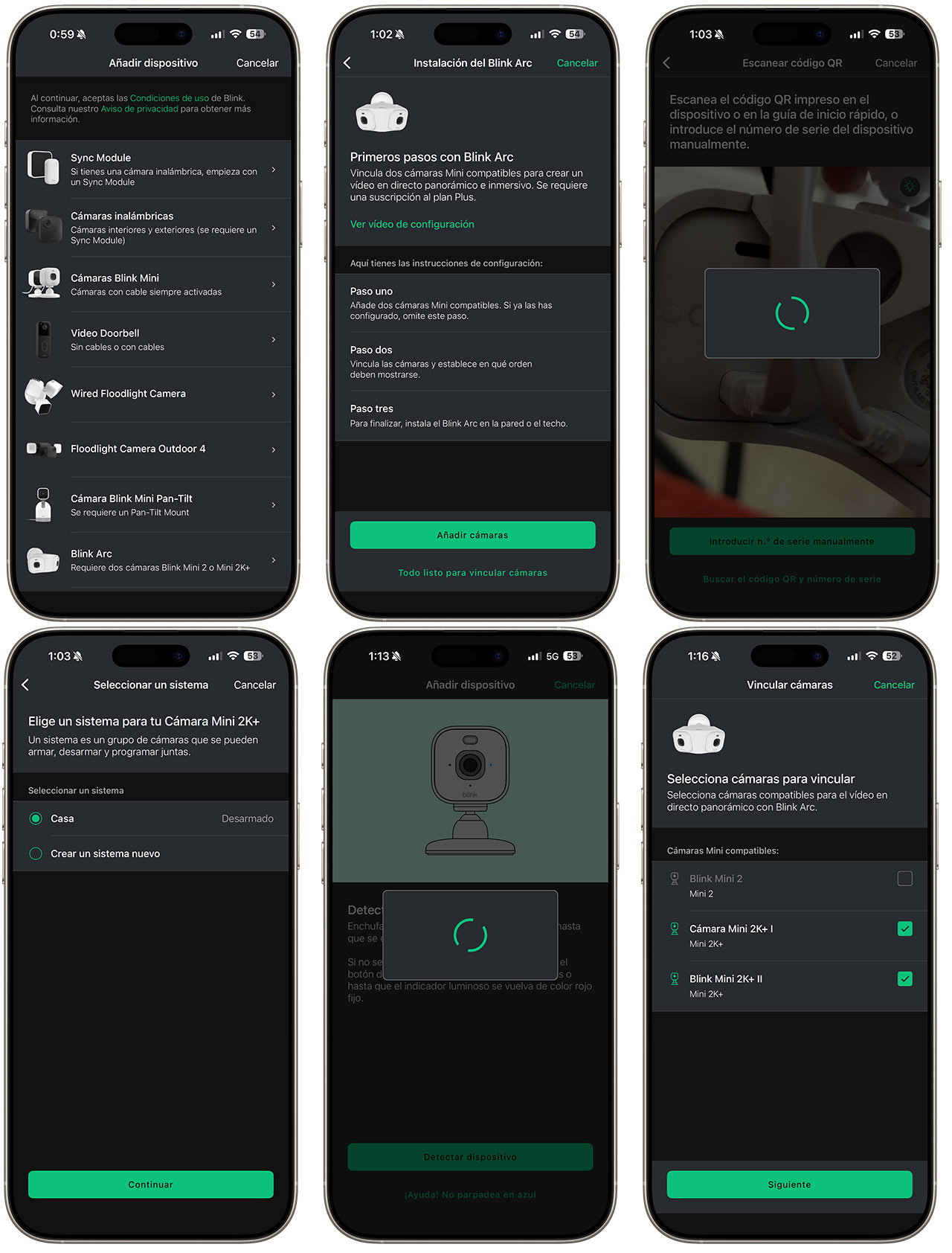 Para configurar la cámara, basta con instalar la app Blink en tu smartphone iOS o Android, y crear una cuenta desde la propia app si no la tienes ya. A continuación, pulsas sobre el icono «Agregar dispositivo» + en la pantalla de inicio de la aplicación Blink, escaneas el código QR de cada dispositivo y sigues las instrucciones de la app.