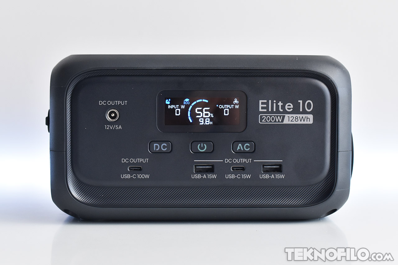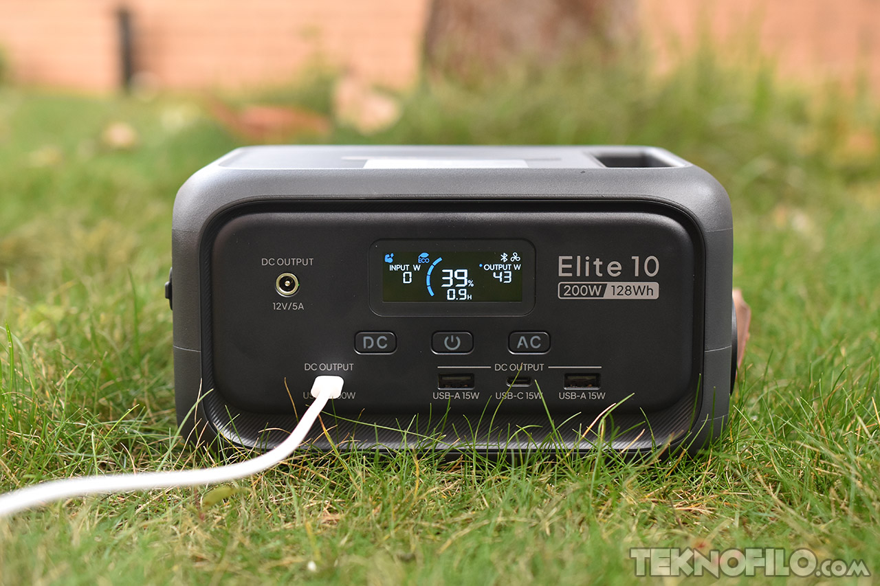 BLUETTI Elite 10 posee una capacidad de 128 Wh y una potencia de salida hasta 200 W. Cuenta con una salida de corriente alterna con enchufe europeo (hasta 200W), 2 puertos USB-C (15W y 100W), 2 puertos USB-A (15W en total) y una salida DC5521 de 12V/5A (60W). Además, admite la carga mediante paneles solares y corriente alterna.