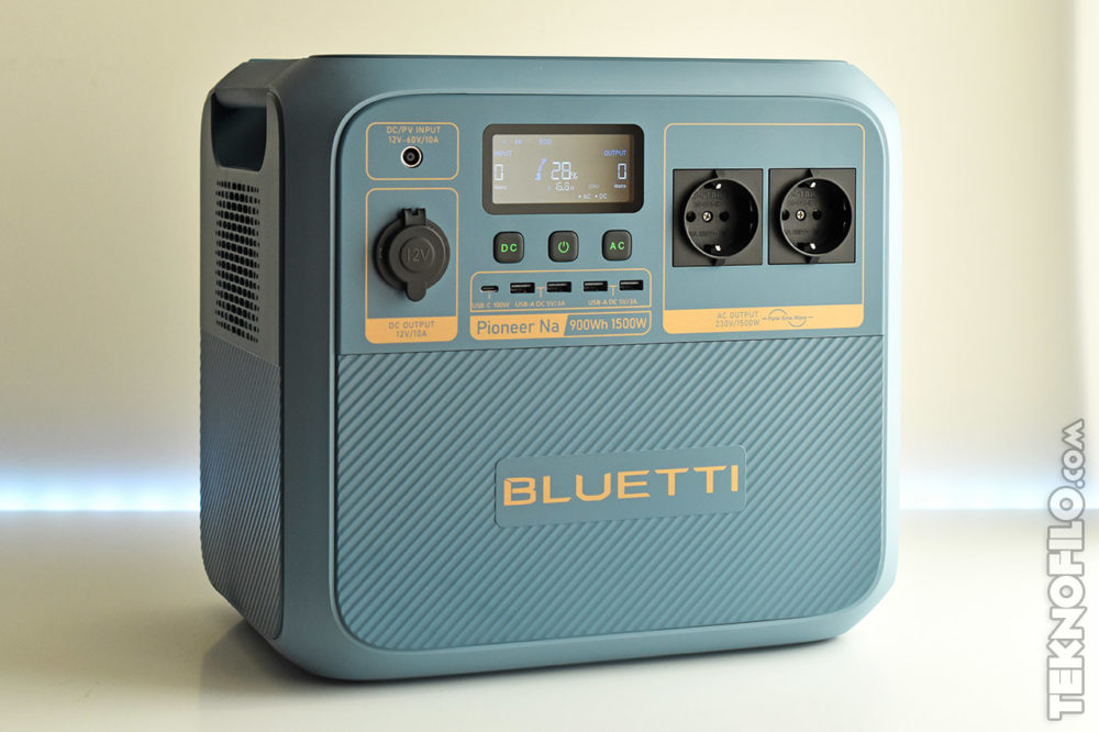 BLUETTI Pioneer Na posee una capacidad de 900 Wh y una potencia de salida hasta 1.500 W. Cuenta con 1 puerto USB-C (100W), 4 puertos USB-A (15W por cada pareja), 1 salida de mechero de coche (120 W), 1 cargador inalámbrico Qi (15W) y 2 salidas de corriente alterna con enchufe europeo (hasta 1.500W). Además, admite la carga mediante paneles solares, corriente alterna y coche.