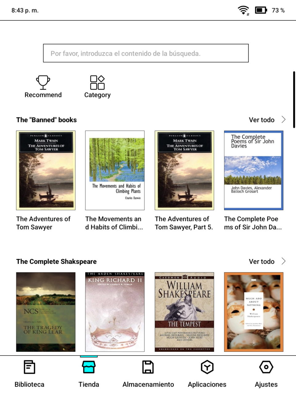 - Tienda: Permite la descarga de libros online, aunque el catálogo es muy limitado.