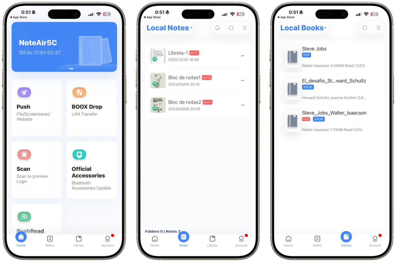 Para transferir documentos al dispositivo desde tu dispositivo móvil, además de las formas anteriores, puedes descargar la app BOOX Assistant para Android o iOS. Esta app no solo permite enviar contenidos, sino también acceder a tus notas.