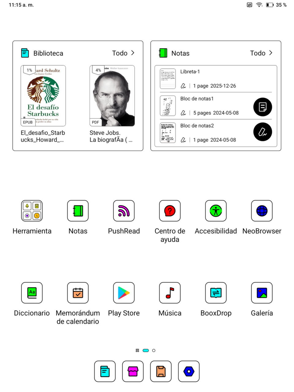 Entre las apps nativas, encontramos BooxDrop, Calculadora, Diccionario, Galería, Grabadora, Memorándum de calendario, Música, NeoBrowser, Play Store, PushRead, Reloj y Salvapantallas.