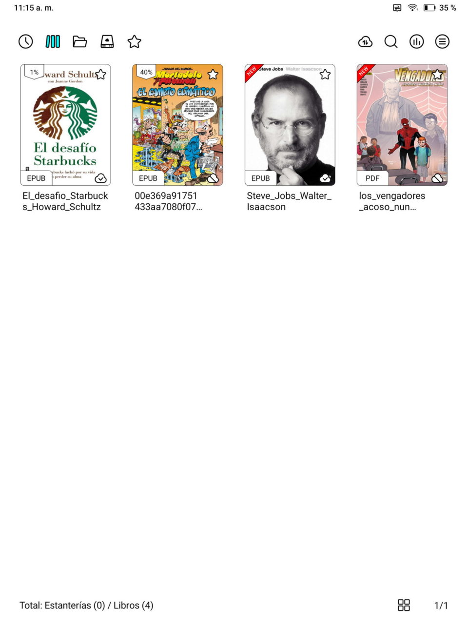 En la parte inferior, tenemos accesos directos a la biblioteca, la tienda de libros, el almacenamiento y los ajustes.