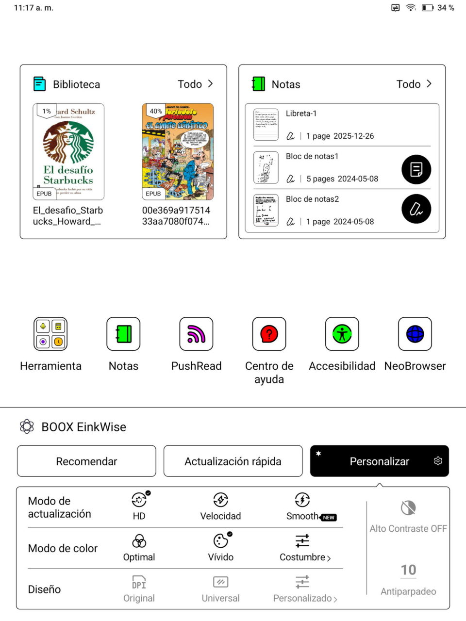 En mis pruebas, he transferido varios libros en formato EPUB y no he tenido ningún problema para leerlos cómodamente en el dispositivo. Con el lápiz, puedes subrayar, tomar notas o dibujar formas sobre la pantalla, que permanecen ahí. Una ventaja de su pantalla a color es que puedes ver documentos o libros ilustrados con mejor calidad que en otros lectores limitados a blanco y negro.