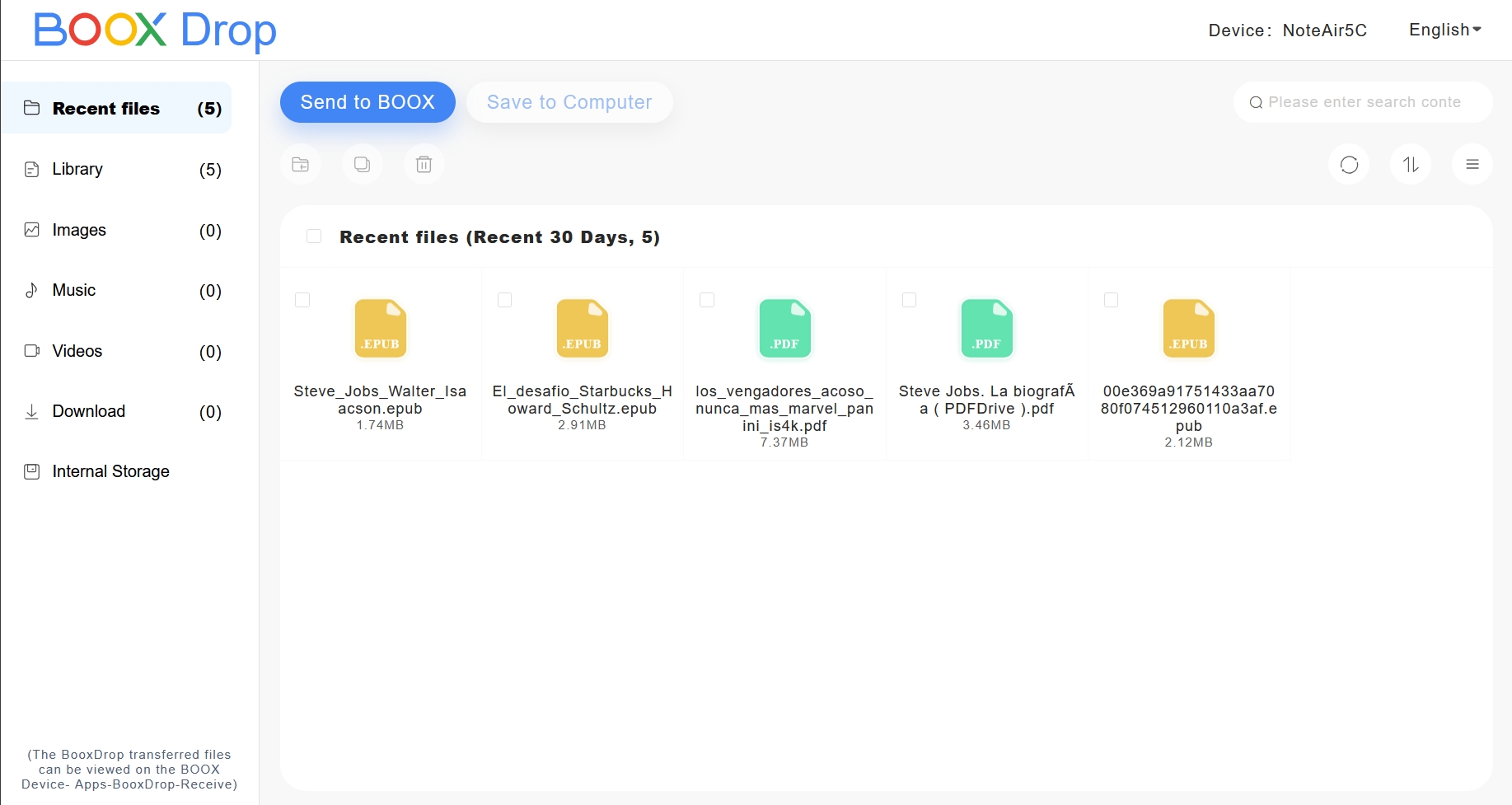 - Si tu BOOX Note Air5 C está conectado a la misma red WiFi que tu ordenador, puedes utilizar la app preinstalada BooxDrop, que permite transferir ficheros con solo teclear una dirección en el navegador de tu ordenador.