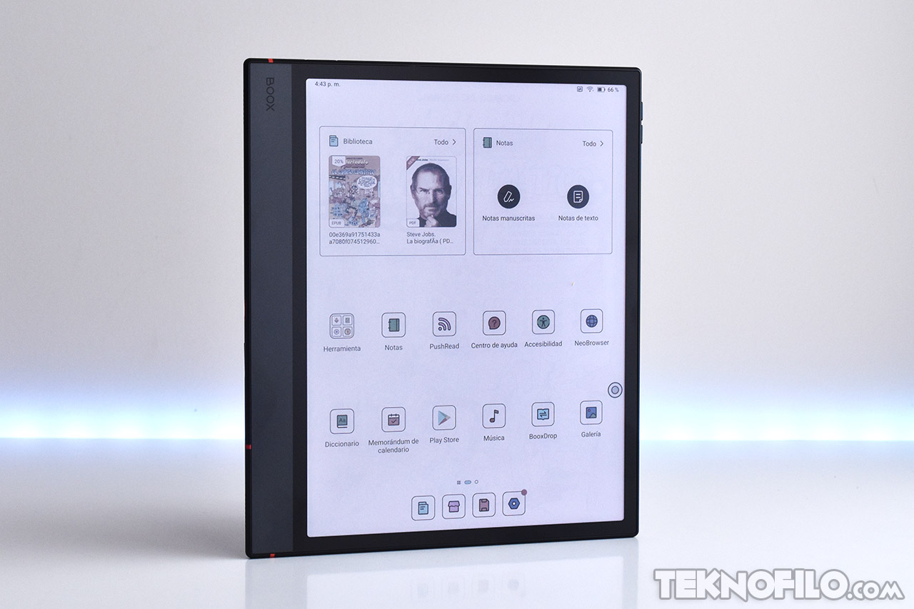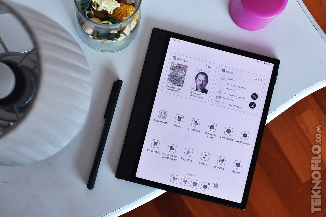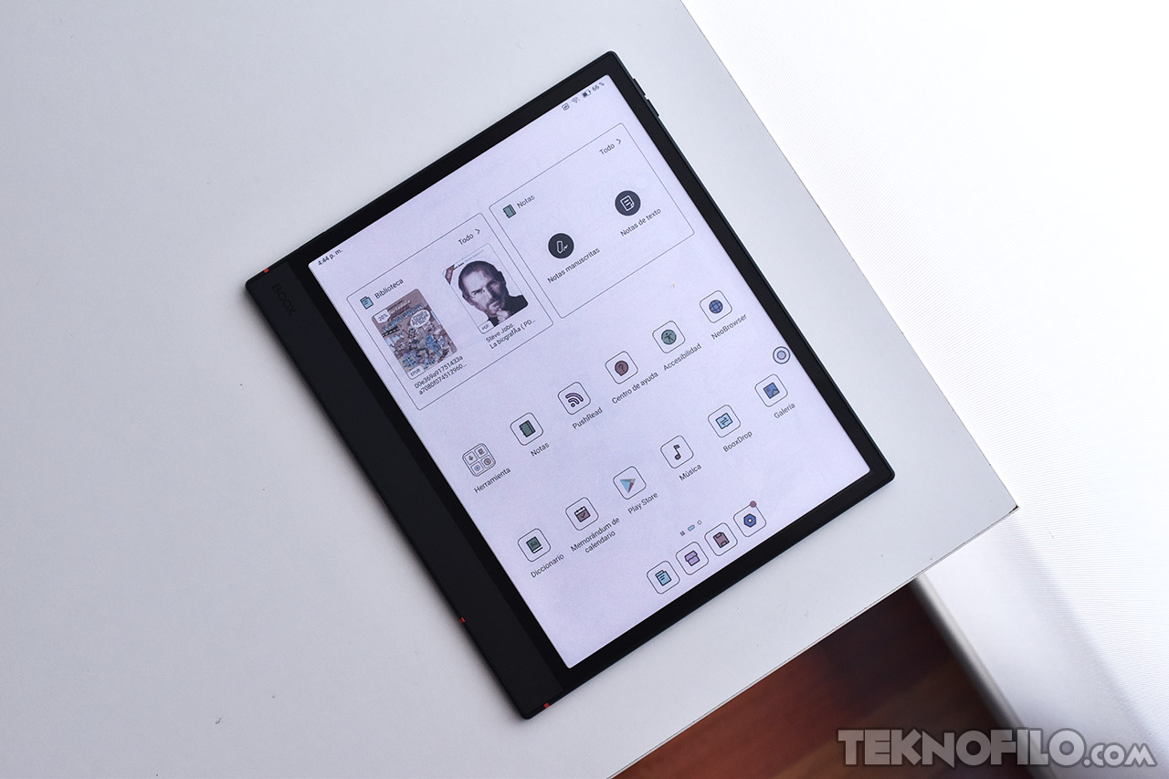 Entre las apps nativas, encontramos BooxDrop, Calculadora, Diccionario, Galería, Grabadora, Memorándum de calendario, Música, NeoBrowser, Play Store, PushRead, Reloj y Salvapantallas.