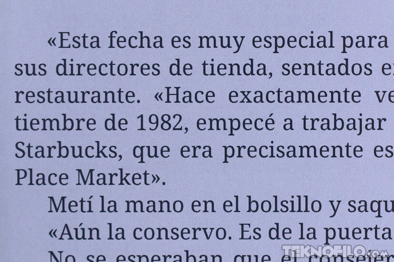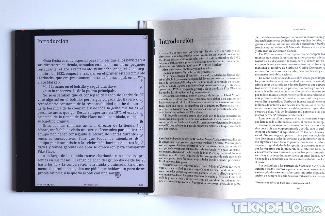 En la siguiente imagen podemos ver una comparativa entre la misma página de un libro real y del BOOX Note Air5 C. Como se puede apreciar, la diferencia de nitidez es inapreciable.