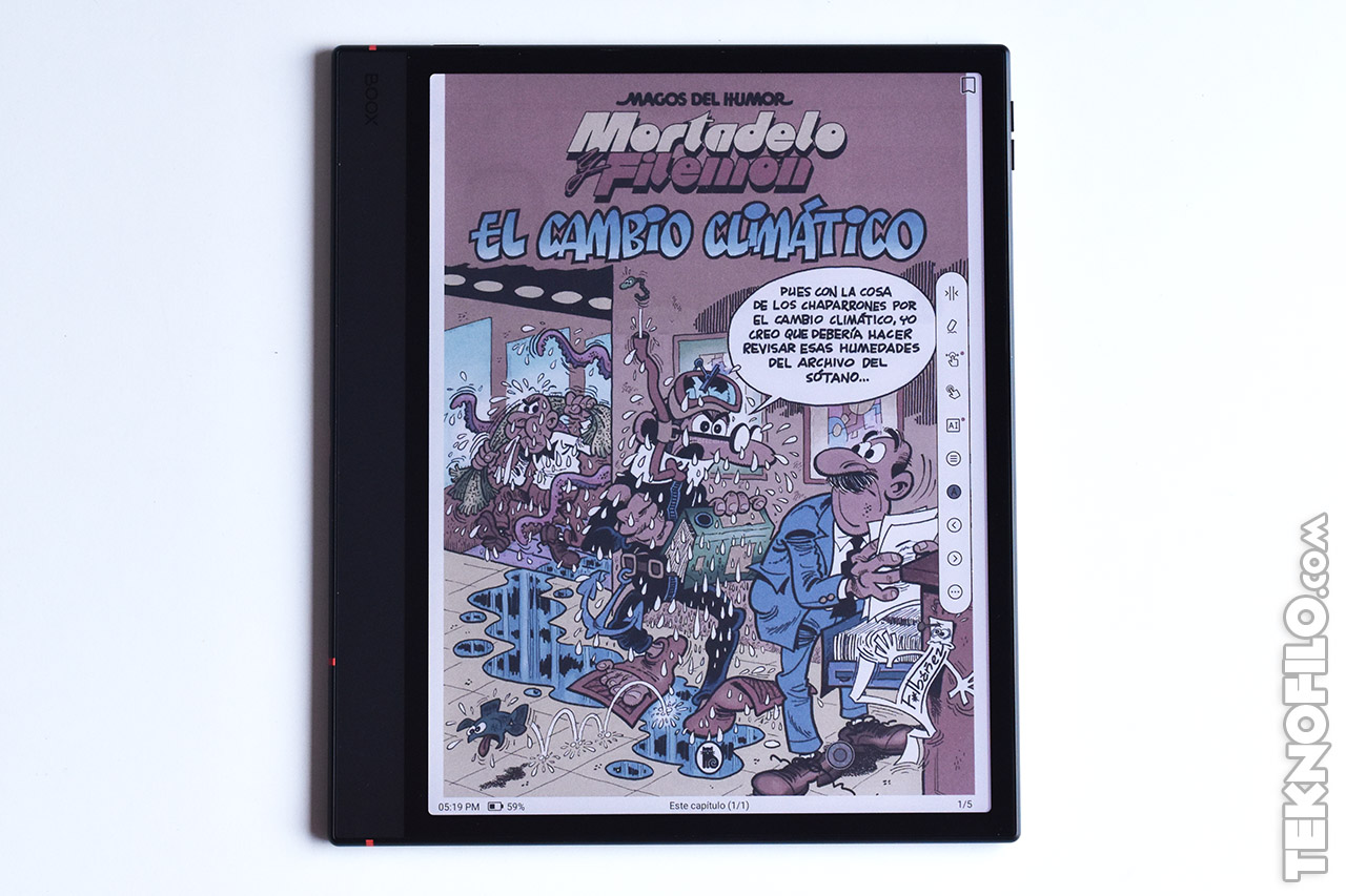 Uno de los aspectos diferenciales del BOOX Note Air5 C es su pantalla de 10.3″ de tinta electrónica a color, que permite disfrutar de contenidos más vivos que los de otros lectores en blanco y negro, así como tomar notas y marcar textos en distintos colores. Debido a las limitaciones de la tecnología de tinta electrónica, los colores se ven bastante más apagados que un tablet, hasta el punto de que a veces parecen tonos de grises en vez de colores.