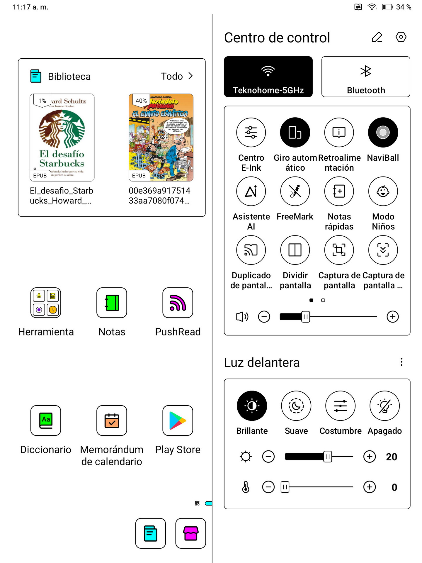La pantalla de inicio incluye una interfaz parecida a la de los tablets, con widgets y aplicaciones. Por defecto, encontramos un par de widgets para Biblioteca con los libros y Notas con las anotaciones tomadas a mano o digitales. Es posible añadir más widgets y modificar su tamaño.