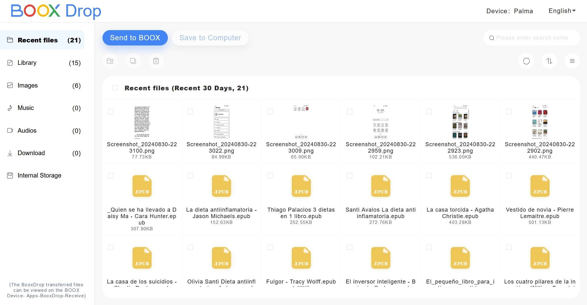 - Si tu BOOX Palma está conectado a la misma red WiFi que tu ordenador, puedes utilizar la app preinstalada BooxDrop, que permite transferir ficheros con solo teclear una dirección en el navegador de tu ordenador.