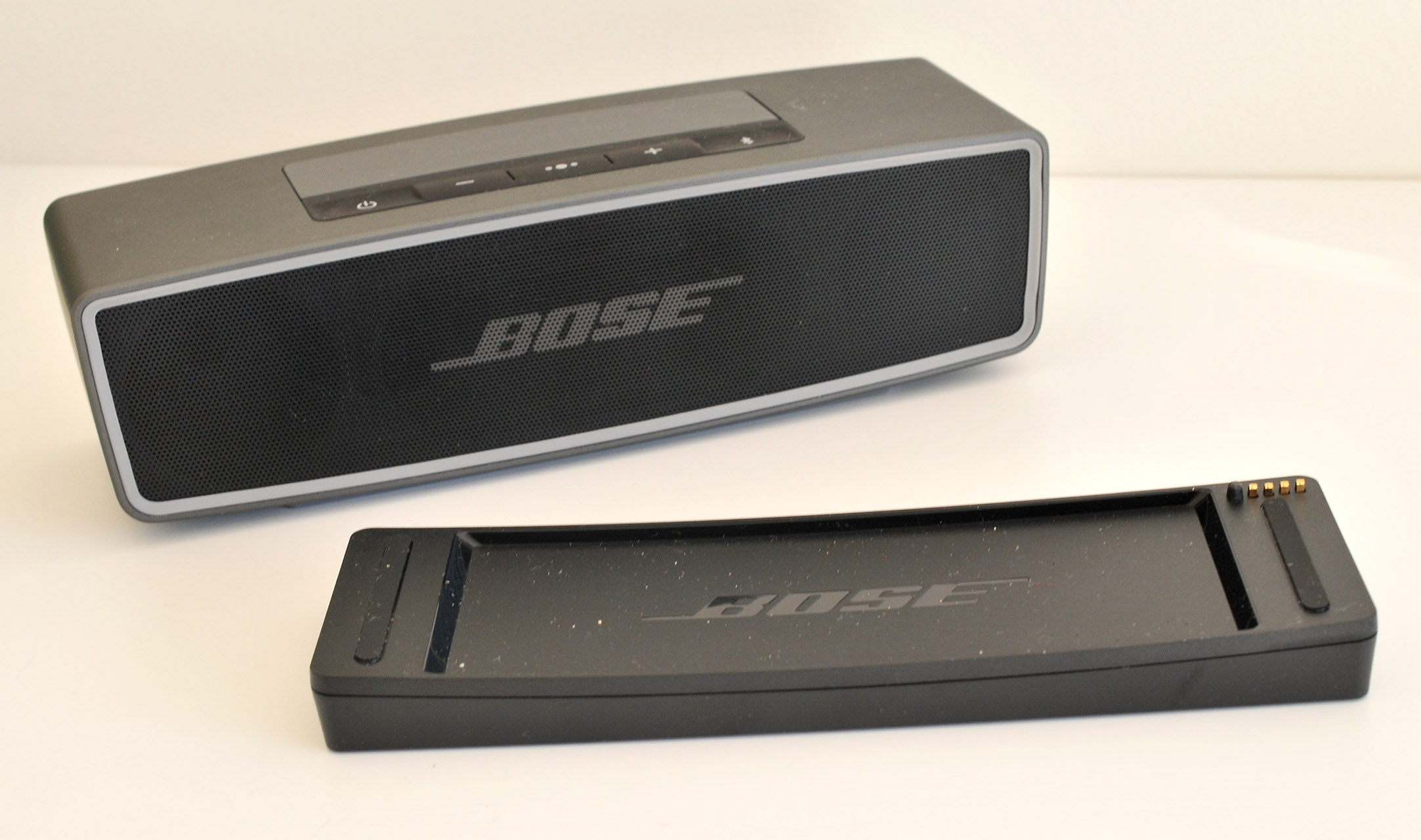 El SoundLink Mini II viene con una base de carga, que tanto en este modelo como el anterior resultan algo difíciles de encajar en el altavoz. Con frecuencia acabamos moviendo el altavoz sobre la base buscando la posición correcta para ambos hagan contacto y comiencen a cargar.