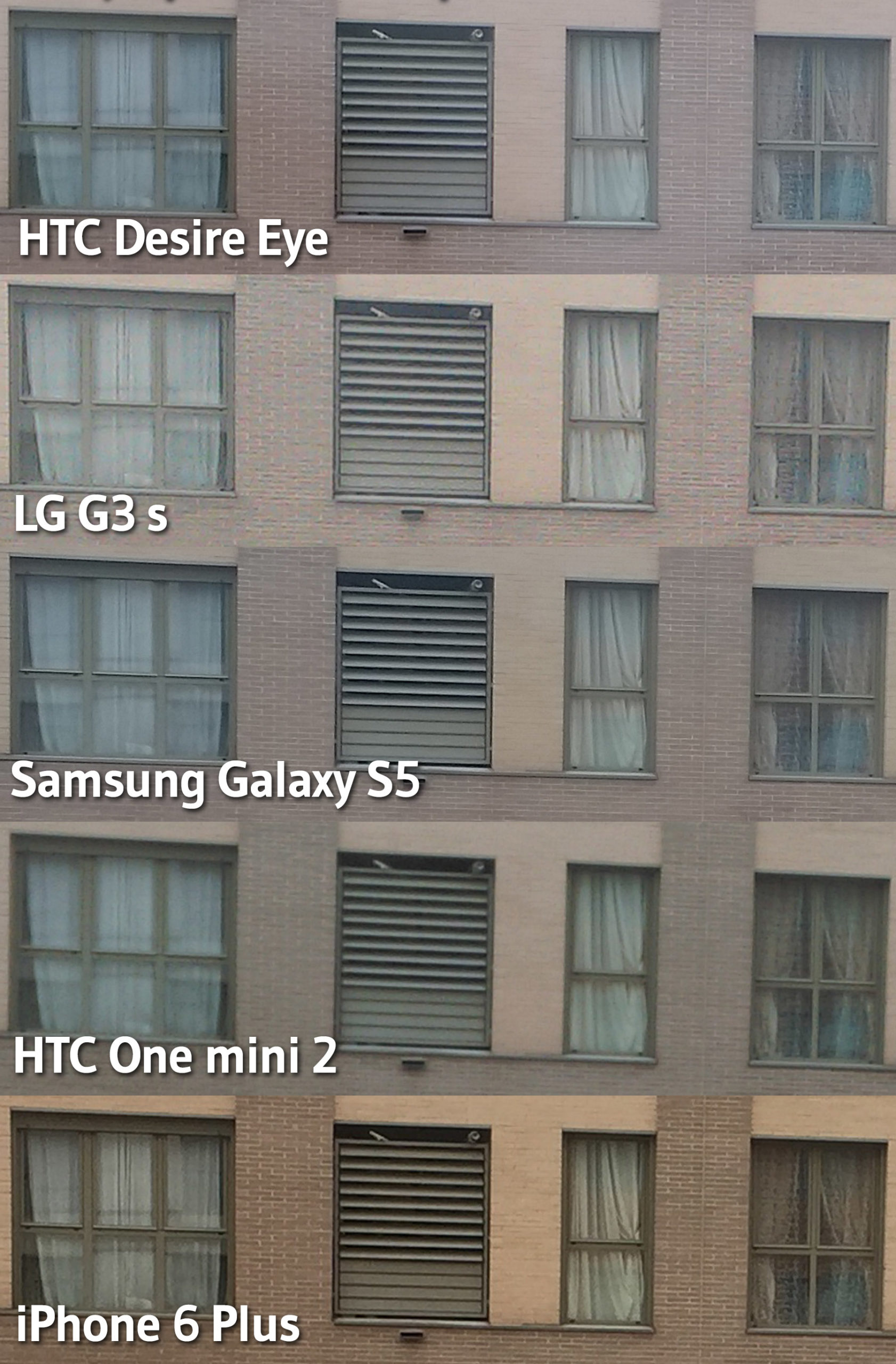 A continuación podemos ver una comparativa donde se aprecia dicha zona de la imagen capturada por distintos teléfonos. Es evidente que esa zona se ve mucho más borrosa en la captura del HTC Desire Eye que en la del resto de dispositivos, salvo en el HTC One mini 2 que también parece mostrar un problema similar.