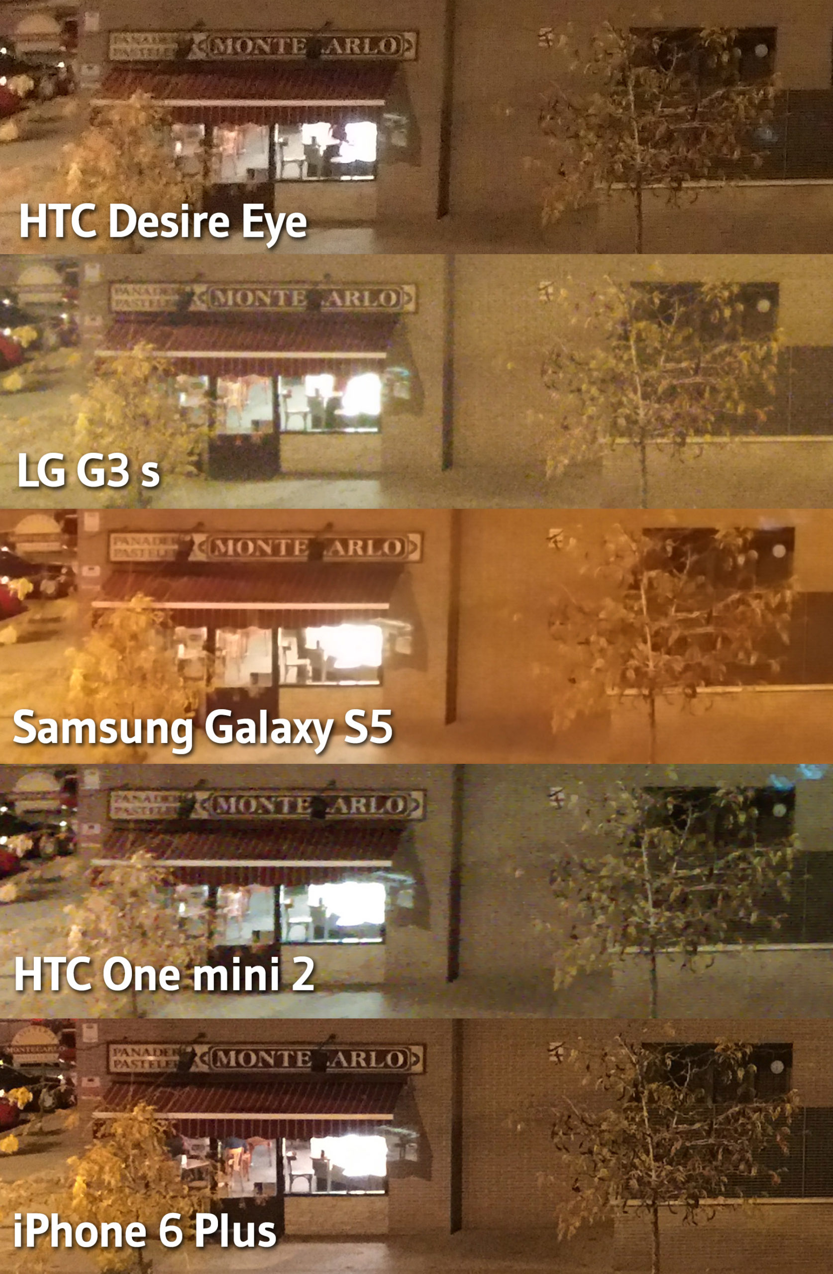 Centrándonos en la cámara trasera, vamos a comparar las imágenes capturadas con el HTC Desire Eye con las capturadas por un conjunto muy diverso de teléfonos: el LG G3 s (8 MP), el Samsung Galaxy S5 (13 MP), el HTC One mini 2 (13 MP), y el iPhone 6 Plus (8 MP).