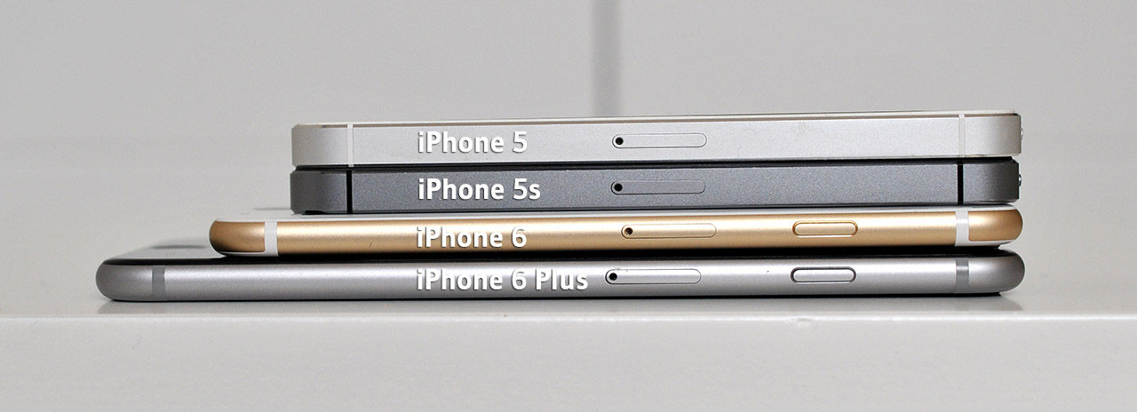 Apple no solamente ha incrementado el tamaño de los últimos modelos de iPhone sino que también los ha hecho más delgados, como puede apreciarse en la siguiente imagen. El iPhone 6 y, en menor medida, el iPhone 6 Plus, es uno de los teléfonos más delgados del mercado.