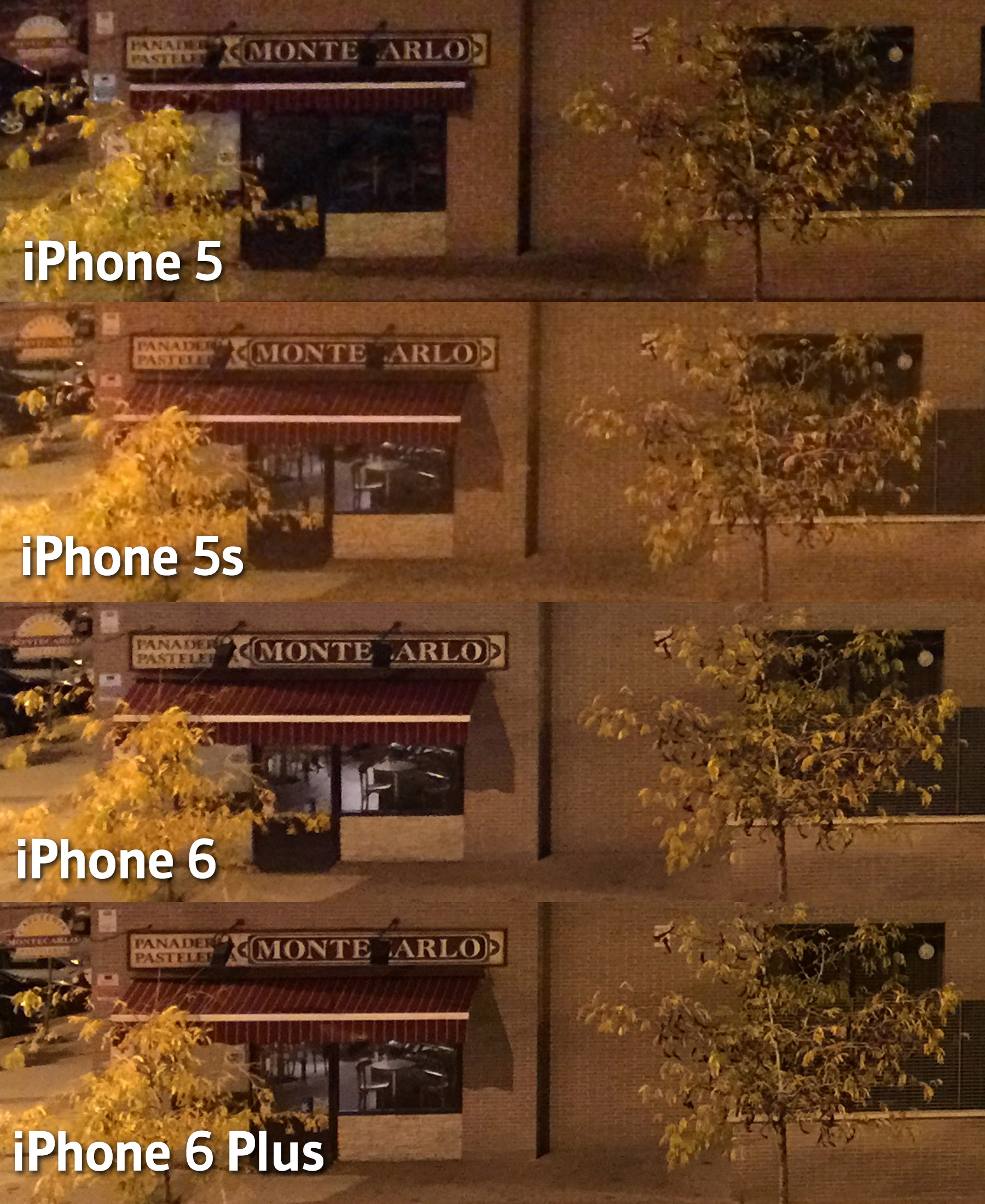 Como se puede apreciar en la comparativa, la calidad de la imagen ha ido mejorando con cada nuevo modelo de iPhone gracias a una reducción progresiva del ruido. Si bien el salto en calidad del iPhone 5 al iPhone 5s fue significativo, el salto del iPhone 5s al iPhone 6 es incluso mayor.