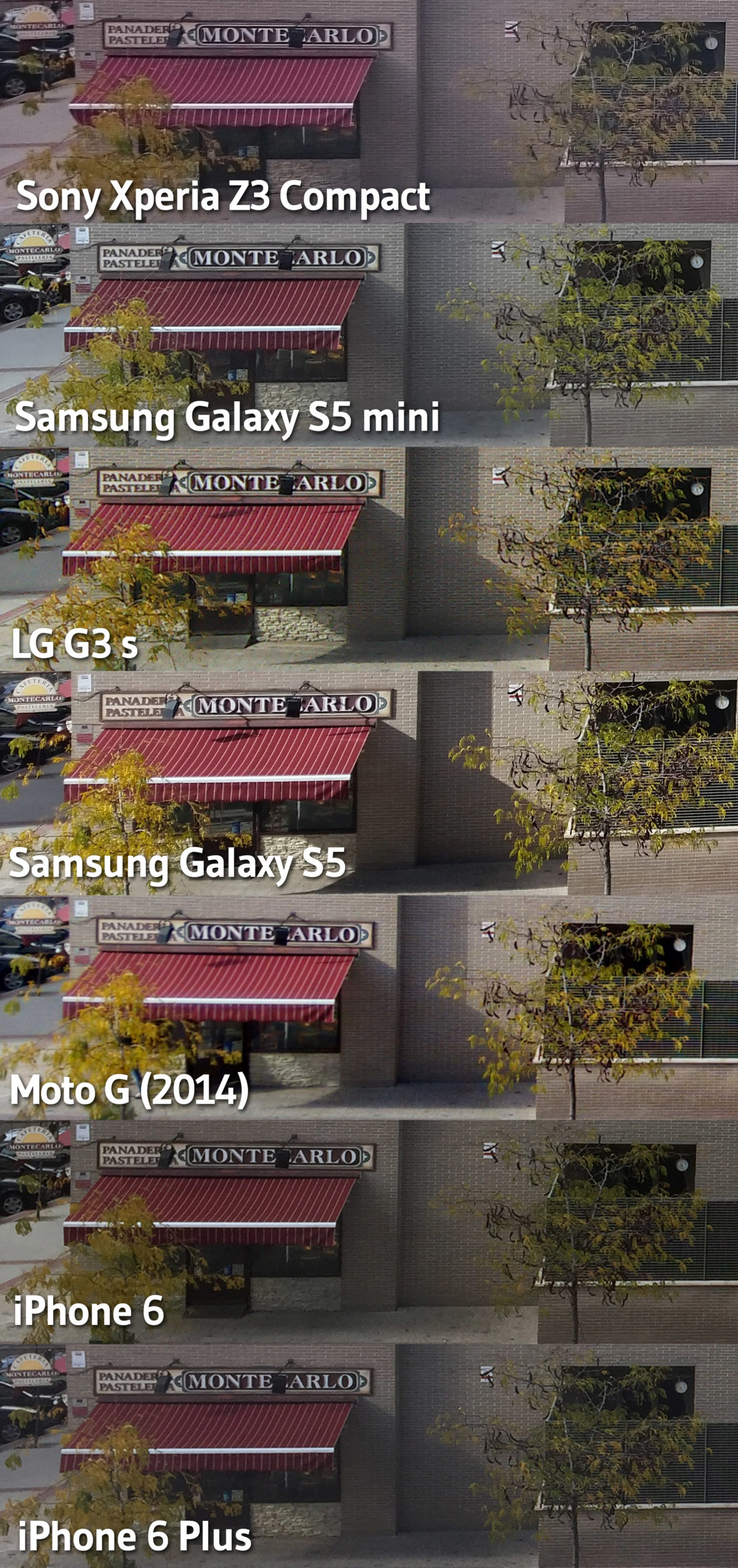 A continuación vamos a comparar la calidad de las imágenes captadas por el iPhone 6 con las capturadas por otros teléfonos como el Sony Xperia Z3 Compact (20 MP), el Samsung Galaxy S5 (13 MP), el Samsung Galaxy S5 mini (8 MP), el nuevo Moto G (8 MP), el LG G3 s (8 MP) y, por supuesto, el iPhone 6 Plus (8 MP).