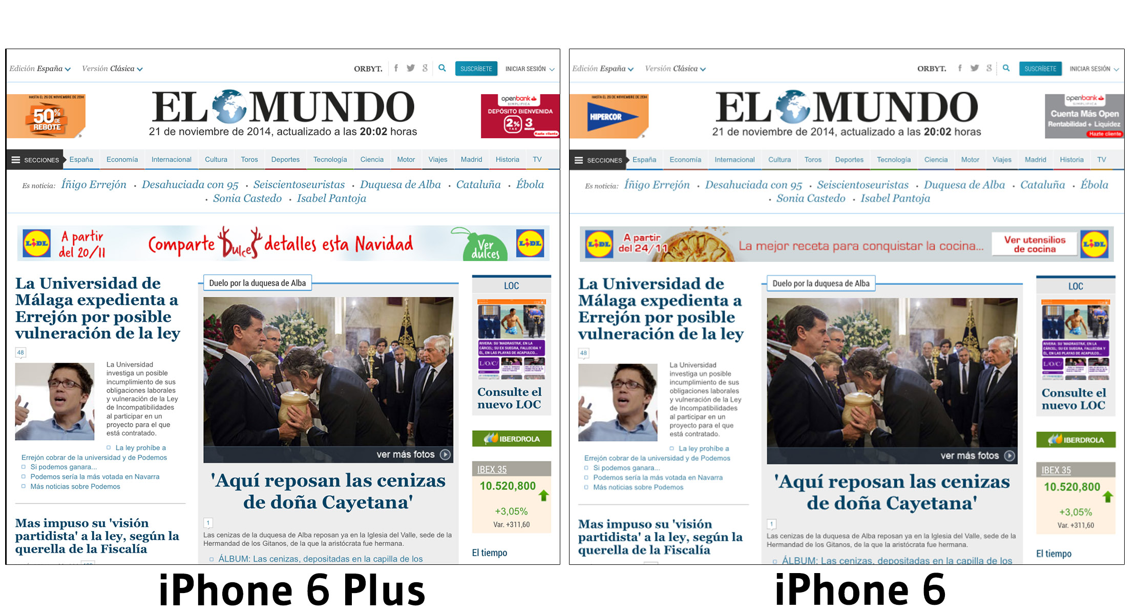 A continuación podemos ver una simulación que hemos creado de cómo se ve la pantalla del iPhone 6 Plus frente a la del iPhone 6 cuando en ambas pantallas mostramos la misma zona de una página web (pulsar encima de la imagen para ampliar).