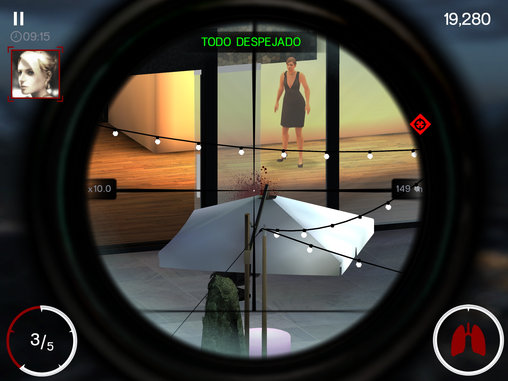 Para apuntar a un objetivo basta con hacer el gesto de pinza sobre la pantalla y comenzaremos a acercar el objetivo a través de la mira telescópica. Podemos ir desplazando el área de visión con los dedos hasta que encontremos a un objetivo al que disparar. De vez en cuando es necesario recargar balas, y también es posible aguantar la respiración para reducir el movimiento del rifle al apuntar.