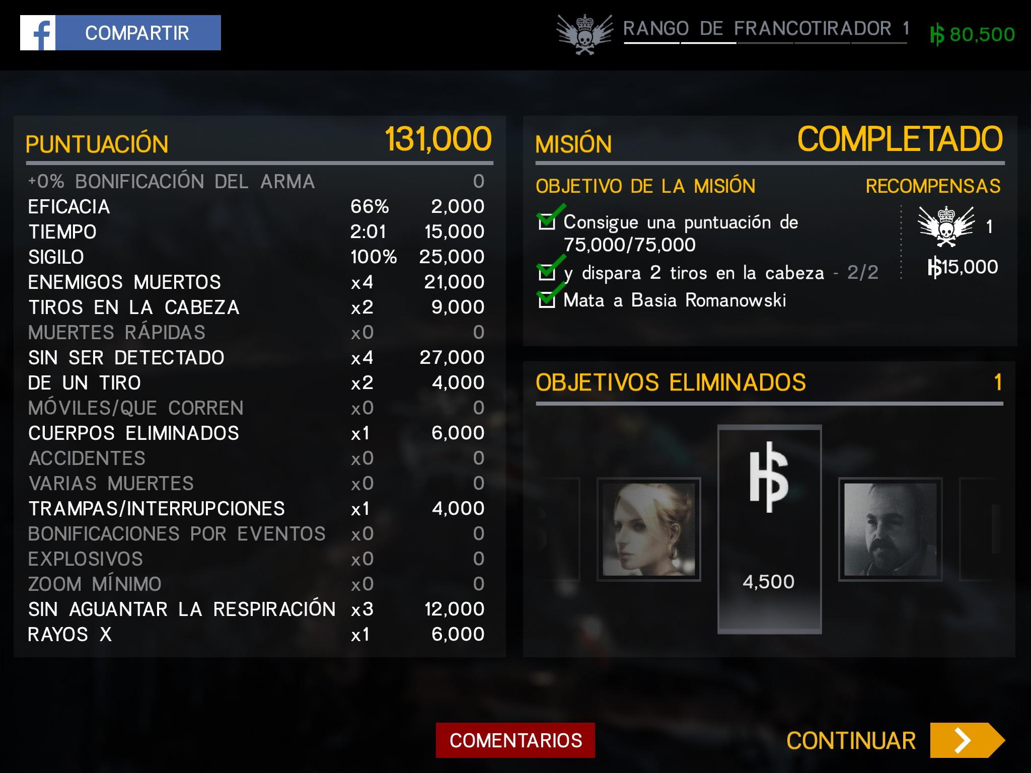 La puntuación obtenida depende de diversas variables, siendo la más importante lo sigilosos y elaborados que sean tus disparos. Por ejemplo, disparar a un enemigo en el tejado da menos puntos que disparar a una caja de fusibles y electrocutar a un guarda cercano que está sobre un charco.