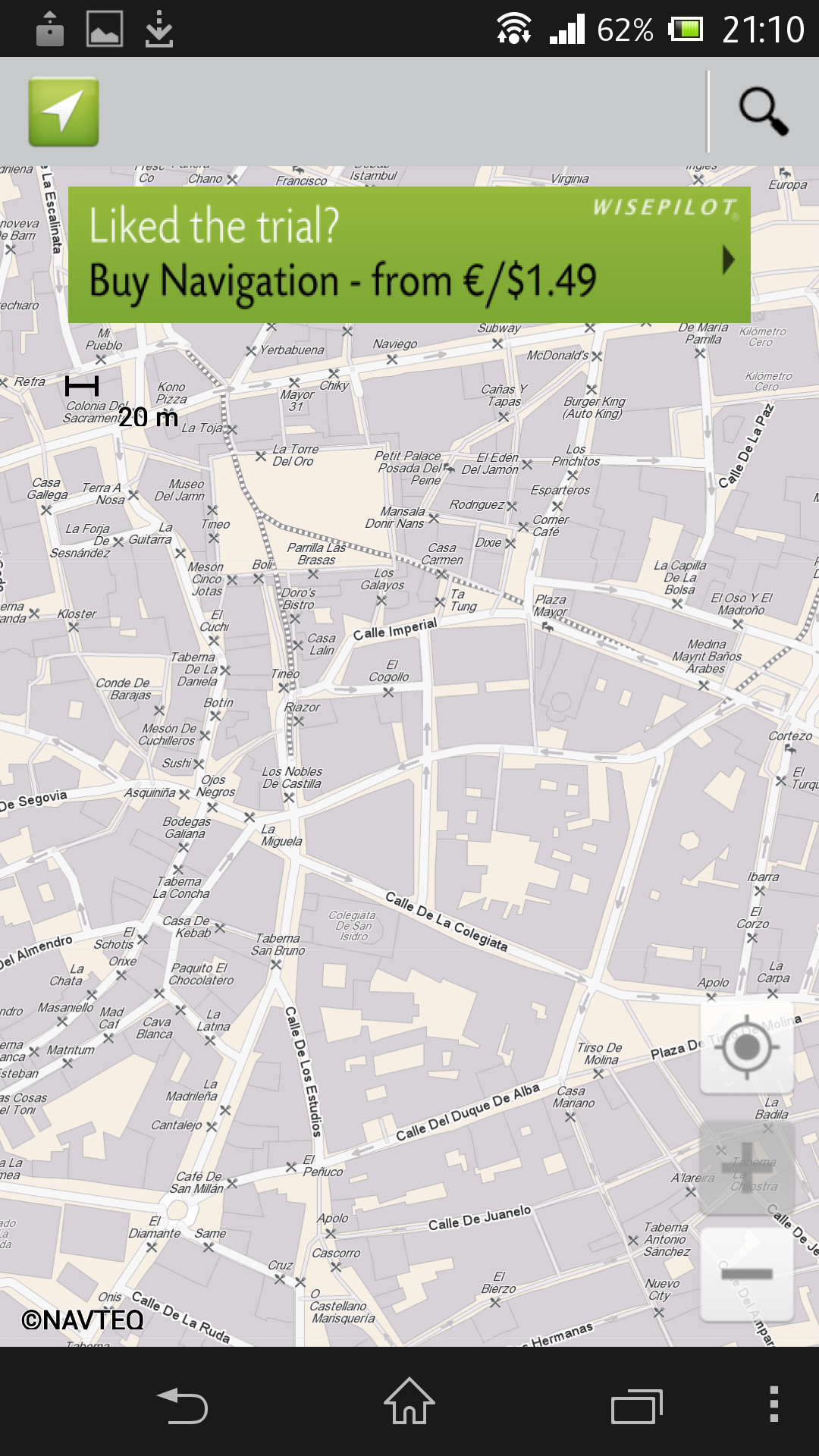Como aspectos negativos, no muestra imágenes por satélite, la información de transporte público no está disponible en España (0 al menos a nosotros no nos funcionó), la funcionalidad de navegación es de pago y muestra recordatorios muy molestos incitándonos a pagar por ella (como se puede apreciar en la imagen adjunta).